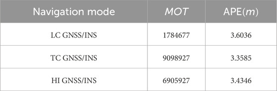 To provide a more intuitive evaluation of the positioning performance of HI, the Average Position Error (APE), defined in Equation 35, is introduced. APE quantifies the positional deviation in terms of three-dimensional distance. Furthermore, computational complexity is assessed by integrating the Number of Satellites (NoS) observed in each epoch. The results shown in Table 7 indicate that the HI system achieves lower computational complexity compared to TC, while also delivering better positioning accuracy than LC. These results highlight the strong practical potential of the HI GNSS/INS approach in real-world applications.