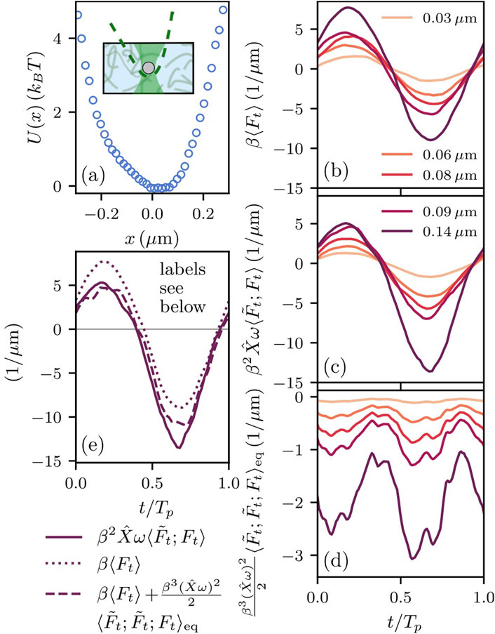Figure 1. (a) Asymmetric optical potential U(x)=kBTlnP(x) felt by the probe particle (inset sketch), with P(x) the probability distribution with the trap at rest. (b) Mean force βFt, (c) force covariance β2X̂ωF̃t,Ft, and (d) equilibrium third cumulant β2(X̂ω)2F̃t;F̃t;Fteq/2, as functions of time, for driving frequency ω=8.4 rad/s and amplitudes X̂={0.03,0.06,0.08,0.09,0.14}µm as labeled. Tp=2πω. (e) Force covariance (solid line), mean force (dotted line), and the sum of mean force and third force cumulant (dashed line, Equation 4) for X̂ = 0.14 µm.
