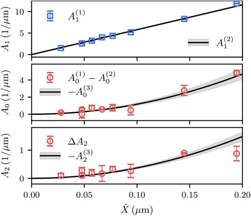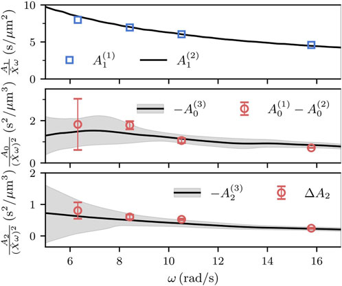 Figure 3. Coefficients Am, normalized as labeled, as a function of the frequency ω. The agreement in the top panel confirms the FDT, and the agreement in the lower panels confirms Equation 4. Each data point is obtained from averaging over driving amplitudes taking the respective scaling of Am with X̂ into account (see SM). Error bars are obtained from partitioning trajectories into two pieces (data points) and from the standard deviation between separate series of measurements (gray area).