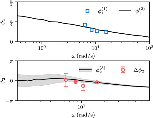 Two graphs display phase angles versus angular frequency. The top graph shows a decreasing trend of \(\phi_1\) with blue squares as data points. The bottom graph shows \(\phi_2\) with a shaded area, red circles with error bars, indicating fluctuations around a steady line. Angular frequency is on a logarithmic scale for both graphs.
