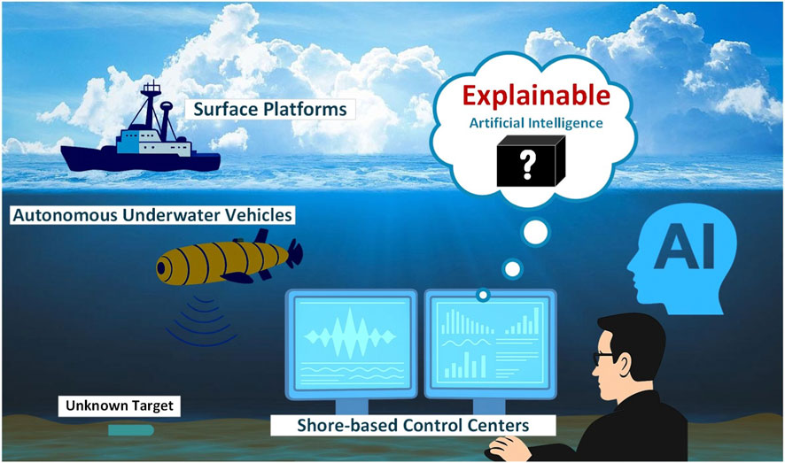 In the practical underwater problems, the explainable demand is particularly prominent. On the one hand, the operating environment is complex and changeable, and the channel interference is serious, so the correctness of the system decision-making results will have a great impact on combat command, autonomous navigation and other tasks; On the other hand, limited by the observation mode and communication bandwidth, the cost of manual intervention is extremely high, and the system urgently needs the ability of “self-explanation and self-diagnosis” to support its stable operation in an uncontrollable environment. In this context, it has become a key research topic to develop an explainable model suitable for underwater perception and decision-making tasks. As shown in Figure 1, it can be seen that AUV (Autonomous Underwater Vehicle) platforms and control centers rely on sonar and artificial intelligence in sensing and decision-making. The opacity of AI models has invoked concern and thus triggered research into the reasoning of complex AI models to improve their transparency, reliability, and controllability in carrying out complex ocean missions.