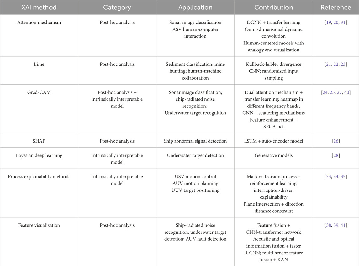 Sun et al. [37] combed the evolution of multi-modal explainable AI technology from three dimensions: data explainability, model explainability and post-processing explainability, and pointed out the development direction of visual data bottleneck breakthrough and truth-free environment interpretation, but the application in underwater scenes lacked systematic analysis. Li et al. [38] adopted a feature-level information fusion strategy, combined with multi-channel CNN-Transformer network to complete multi-scale feature extraction, and realized high-precision underwater target recognition under the condition of low signal-to-noise ratio. Cai et al. [39] built a detection system based on underwater acousto-optic multimodal cooperation, which transformed the camera results into auxiliary constraints for sonar detection, and adopted the improved Faster R-CNN framework to realize cooperative detection. Zheng et al. [40] combined the feature selection method based on the visualization technology (Grad-CAM) with the local feature enhancement method based on the sub-regional channel aggregation net (SRCA-Net). The study provided a visual basis for acoustic feature selection by fusing the network model. Zhang et al. [41] used multi-sensor feature fusion KAN network (MFKAN) to realize the effective fusion of feature levels and enhance the expression ability of fault features in the background of marine noise. Nevertheless, the challenges of real-time and cross-modal consistency will still be faced in the future. Table 1 summarizes an overview of explainable underwater target recognition models organized by explainability methods.