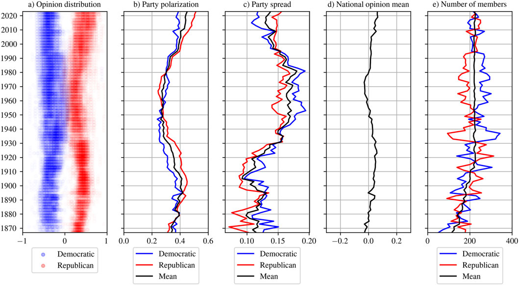 Figure 1. (a) Opinion distributions of the Democratic and Republican party members from 1868 to 2022, (b) absolute values of the polarizations of the two parties and their mean, (c) spreads of the two parties and their mean, (d) the average of the opinion means of the two parties, and (e) the numbers of congresspeople in the two parties and their means.