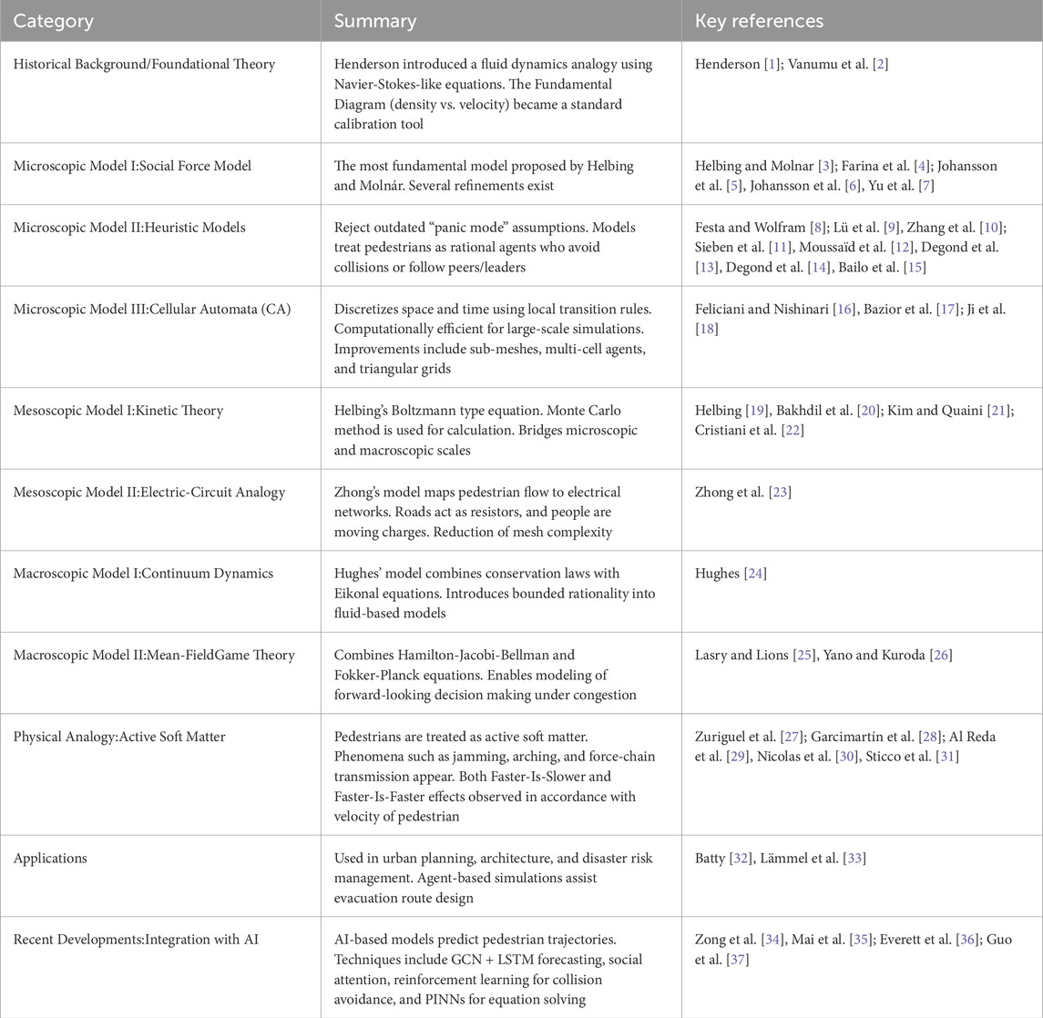 This Research Topic, Innovative Approaches to Pedestrian Dynamics: Experiments and Mathematical Models, brings together contributions that exemplify the current state of research in the study of human and animal mobility, with a focus on bridging theoretical advances, computational techniques, and practical applications. The Research Topic underscores the growing interdisciplinarity of pedestrian dynamics, a field that lies at the crossroads of applied mathematics, physics, engineering, computer science, and behavioral studies. Several contributions expand the repertoire of mathematical models for collective dynamics and deepen our understanding of how temporal and environmental factors modulate collective behavior. For reference, a brief review of previous studies of pedestrian dynamics, in which experimental study is excluded, is summarized in Table 1.