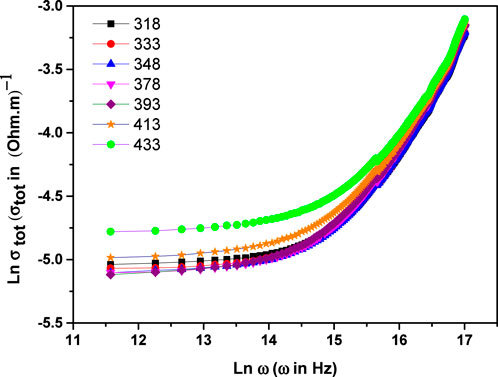 Line graph depicting the relationship between the natural logarithm of frequency (Ln ω in Hz) and the natural logarithm of total conductivity (Ln σ_tot in Ohm.m^-1) for temperatures 318 K to 433 K. Different colored lines represent different temperatures, showing an upward trend in conductivity with increasing frequency.