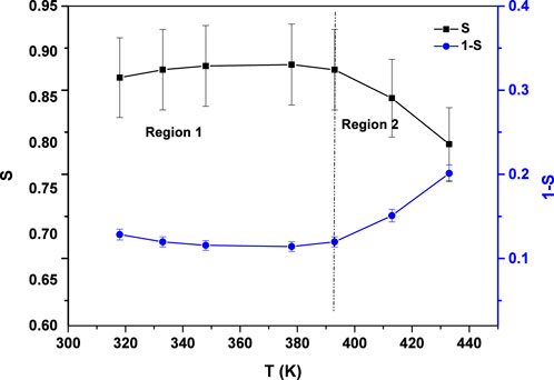 Graph showing two datasets, S and 1-S, plotted against temperature in Kelvin. S is represented by black squares with a decreasing trend from 318 to 433 K, divided into Region 1 and Region 2. 1-S, shown in blue circles, follows an upward trend. Error bars indicate variability.