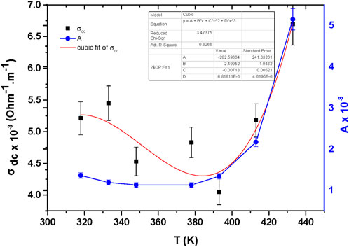 Graph showing the relationship between temperature (T) in Kelvin and conductivity (\( \sigma_{dc} \times 10^{-3} \) Ohm\(^{-1}\)m\(^{-1}\)) and term A. Black squares represent \( \sigma_{dc} \) data points, and blue circles represent A values. A cubic fit line in red follows the \( \sigma_{dc} \) curve. An inset table details the cubic equation: \( y = A + Bx + Cx^2 + Dx^3 \) with corresponding coefficients and errors. The temperature range is from 318 to 433 K.