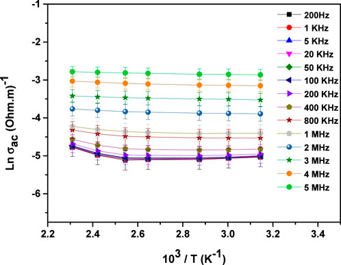 Graph showing the relationship between the natural logarithm of conductivity (Ln σ_ac) and the inverse of temperature (10^3/T) for various frequencies ranging from 200 Hz to 5 MHz. Different colored markers represent each frequency, with conductivity generally increasing with temperature across frequencies. Error bars indicate variability in measurements.