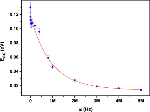 Figure 6 illustrates how the AC activation energy ΔEac varies with frequency ω, revealing an exponential decline in ΔEac as the frequency rises. This decline in AC activation energy ΔEac with increasing frequency could be attributed to a greater rate of electronic transitions between localized states, facilitated by the enhanced energy available at higher (31). Similar behavior is observed in other materials, including both amorphous and crystalline types, where frequency significantly affects the conduction mechanism. This underscores the predominance of hopping conductivity, as charge carriers tend to move between localized states more effectively at higher frequencies (37).