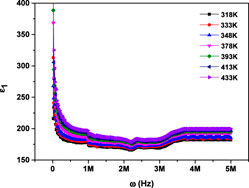 Line graph showing the variation of a parameter labeled as ε₁ over frequency ranging from 0 to 5 MHz at six different temperatures (318K to 433K). Each temperature is represented by a distinct color. The graph shows a steep decline followed by a plateau.
