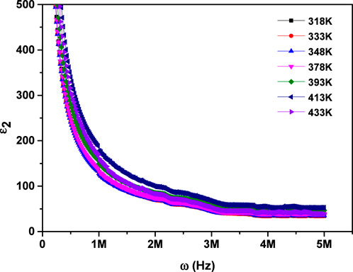 Graph showing dielectric constant (\( \epsilon_2 \)) versus frequency (\( \omega \)) across temperatures 318K to 433K. Curves descend from around 500 to stabilize below 100 as frequency increases from 0 to 5 MHz. Different colors represent temperatures.