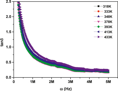 Figure 9 illustrates how the dielectric loss tangent (tan δ) varies with frequency across different temperature conditions. The figure revealed an exponential decrease of tanδ as frequency increased. The dielectric loss tangent graph shows the same trend as the dielectric constant’s behavior. At low frequency, tanδ has a higher value, whereas it diminishes at high values of frequencies. The reduction in tan δ at higher frequencies can be attributed to the inability of charge carriers to keep pace with the rapidly oscillating electric field. Once the frequency surpasses a certain threshold, the rate of charge hopping lags behind the field variation, resulting in diminished energy dissipation and thus a lower dielectric loss tangent (28).
