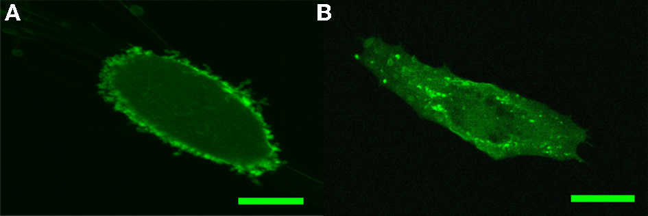Confocal imaging of PH-PLC-GFP expression pattern in HSF and BAEC. (A) Characteristic PH-PLC-GFP expression in HSF. (B) Characteristic PH-PLC-GFP expression in BAEC. Scale bars: 20 μm.