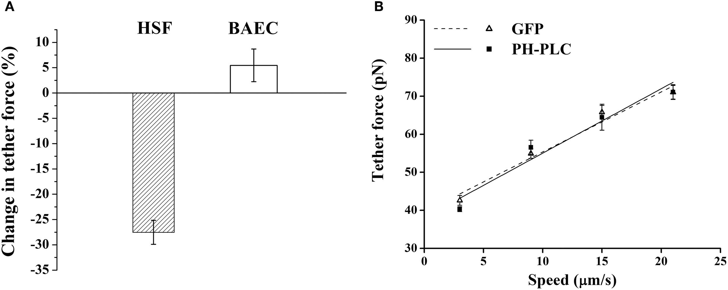 Effect of PIP2 on the tether force. (A) Change in the magnitude of tether force upon PH-PLC-GFP transfection at 15 μm/s tether extraction speed. In HSF the negative value of the change corresponds to a drop in tether force, whereas in BAEC the change is within the experimental error. (B) Tether force versus pulling speed in BAEC transfected with PH-PLC-GFP. Cells treated with GFP alone were used as control. The two curves are statistically indistinguishable (p > 0.05). (The slope of two curves, 2πηeff, is 1.60 pN·s/μm and 1.67 pN·s/μm, respectively, for the GFP treated cells and cells transfected with PH-PLC-GFP). Error bars represent SEM.