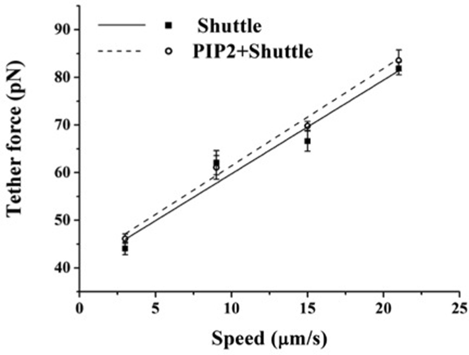 Effect of exogenous PIP2 on the tether force. Tether force vs. pulling speed in BAEC treated with PIP2-Shuttle. Cells treated with the Shuttle alone were used as control. The two curves are statistically indistinguishable (p > 0.05). (The slope of the curves, 2πηeff, is 1.97 pN·s/μm and 2.04 pN·s/μm, respectively, for the cells treated with Shuttle alone and cells loaded with exogenous PIP2+Shuttle). Error bars represent SEM.