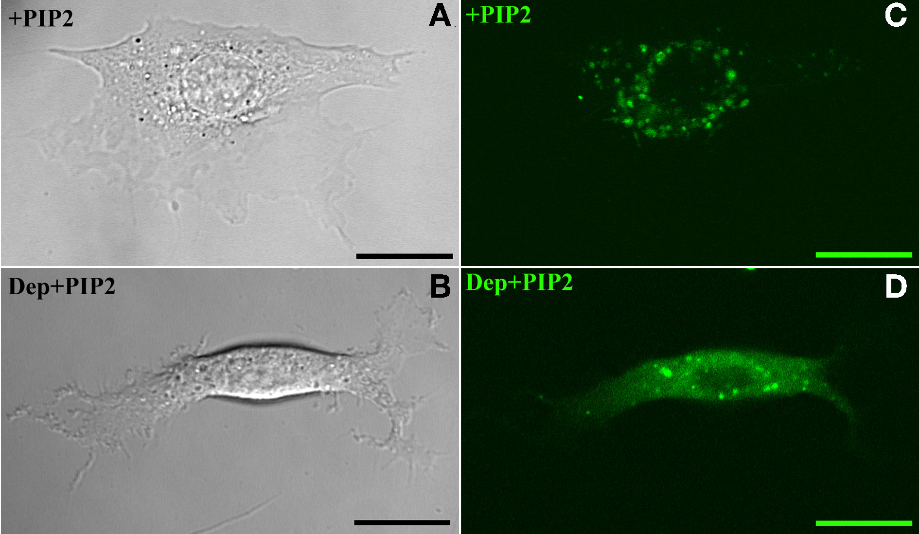 Exogenous PIP2 localization. Panels on the left and right, respectively, refer to images acquired with Differential Interference Contrast and confocal microscopy. (A,C) PIP2-loaded BAEC. (B,D) Cholesterol-depleted BAEC loaded with exogenous PIP2. Scale bars: 20 μm.