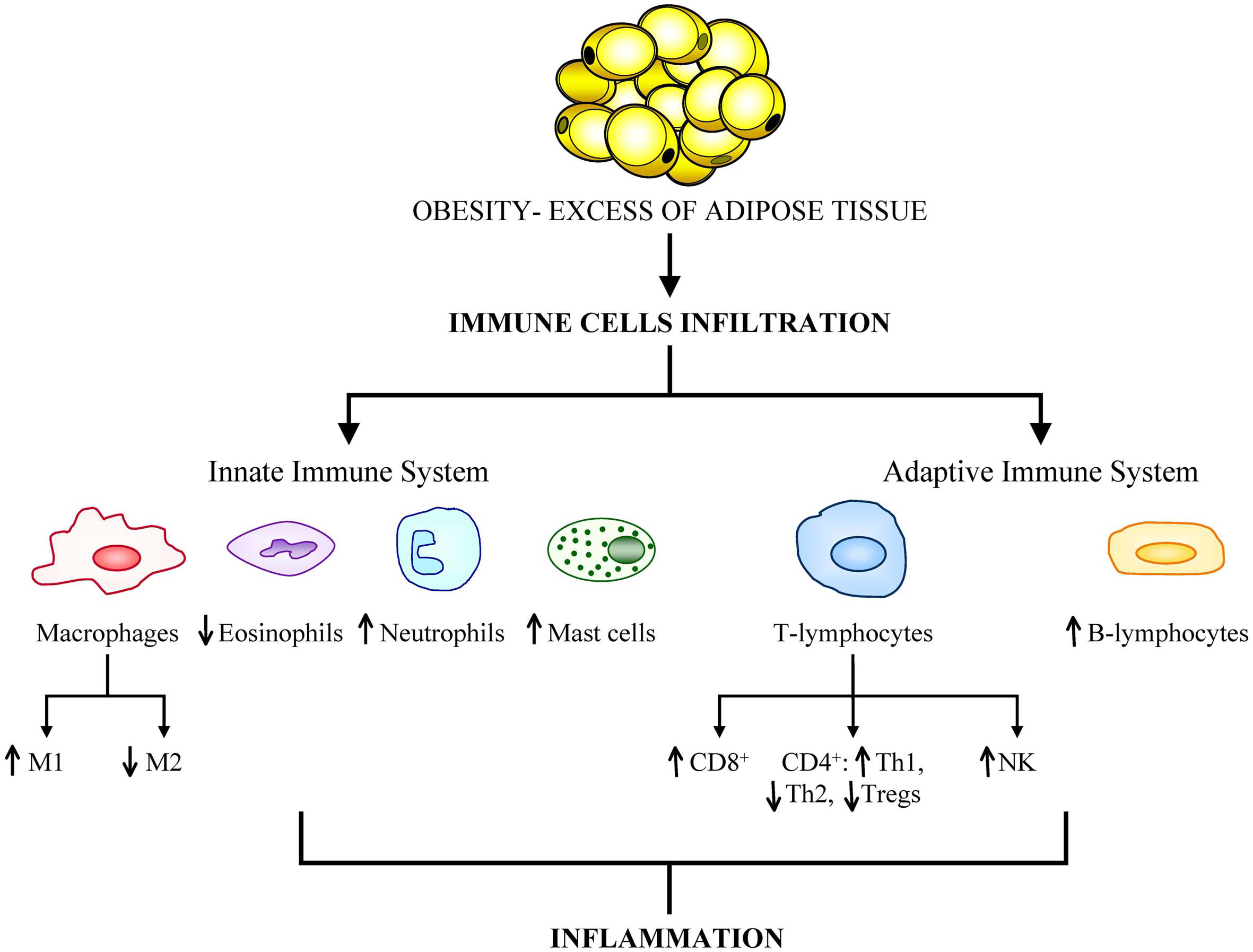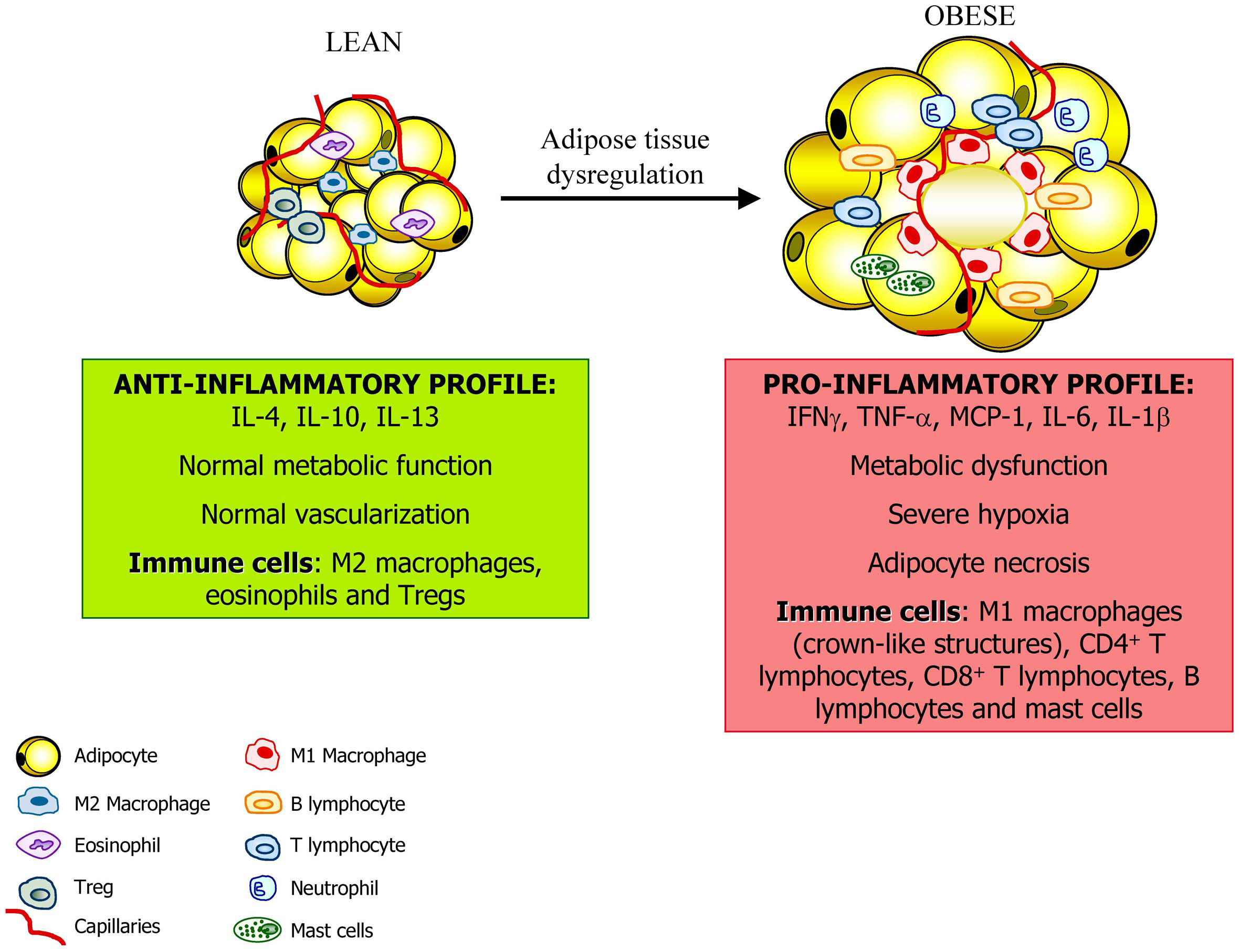Adipose tissue constitutes an active endocrine organ. In the lean state, adipose tissue exhibits resident macrophages polarized toward an M2 status and Treg cells involved in support a metabolic homeostasis. Moreover, the inflammation is controlled through the eosinophil-derived interleukin (IL)-4 and IL-13 as well as the IL-10 secreted by Treg cells and M2 macrophages. With a progression of obesity, adipocytes undergo hypertrophy and release adipokines that promotes the acquisition of an M1 macrophage phenotype with increased production of pro-inflammatory factors such as tumor necrosis factor-α, (TNF-α), monocyte chemotactic protein (MCP)-1, and IL-6. This is accompanied by the infiltration of mast cells and T lymphocytes contributing to the dysregulation of adipose tissue and favoring and perpetuating an inflammatory state.