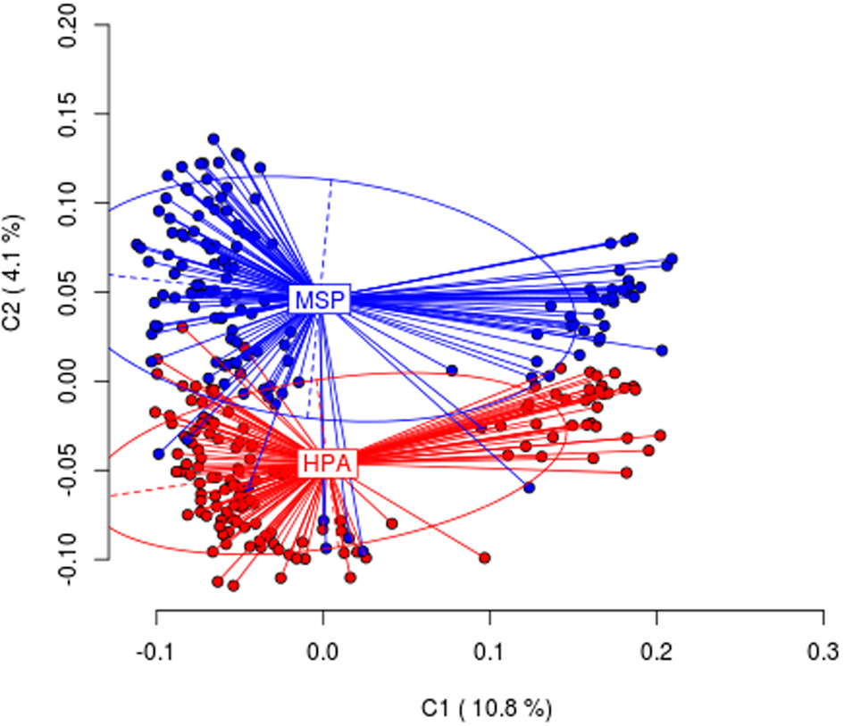 Results from Principal Coordinates Analysis (PCoA) for the HpaII/MspI comparison in all tissues analyzed. The first two coordinates (C1 and C2) are displayed with the indication of the percentage of variance explained in brackets. Scores represent individual samples. Labels indicate the centroids of each group. Ellipses represent the dispersion associated to each value. The long axis of the ellipse shows the direction of maximum dispersion and the short axis shows the direction of minimum dispersion.