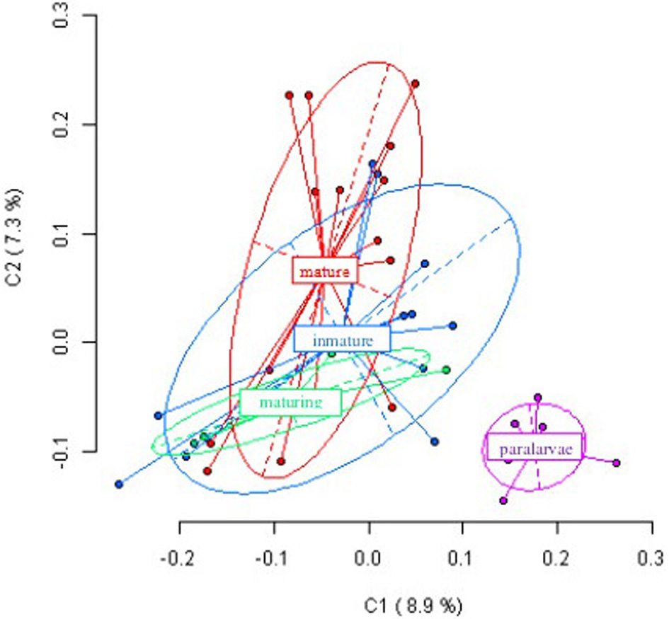 Results from Principal Coordinates Analysis (PCoA) for the epigenetic differentiation between immature, maturing, adult and paralarvae samples. The first two coordinates (C1 and C2) are displayed with the indication of the percentage of variance explained in brackets. Scores represent individual samples. Labels indicate the centroids of each group. Ellipses represent the dispersion associated to each value. The long axis of the ellipse shows the direction of maximum dispersion and the short axis shows the direction of minimum dispersion.