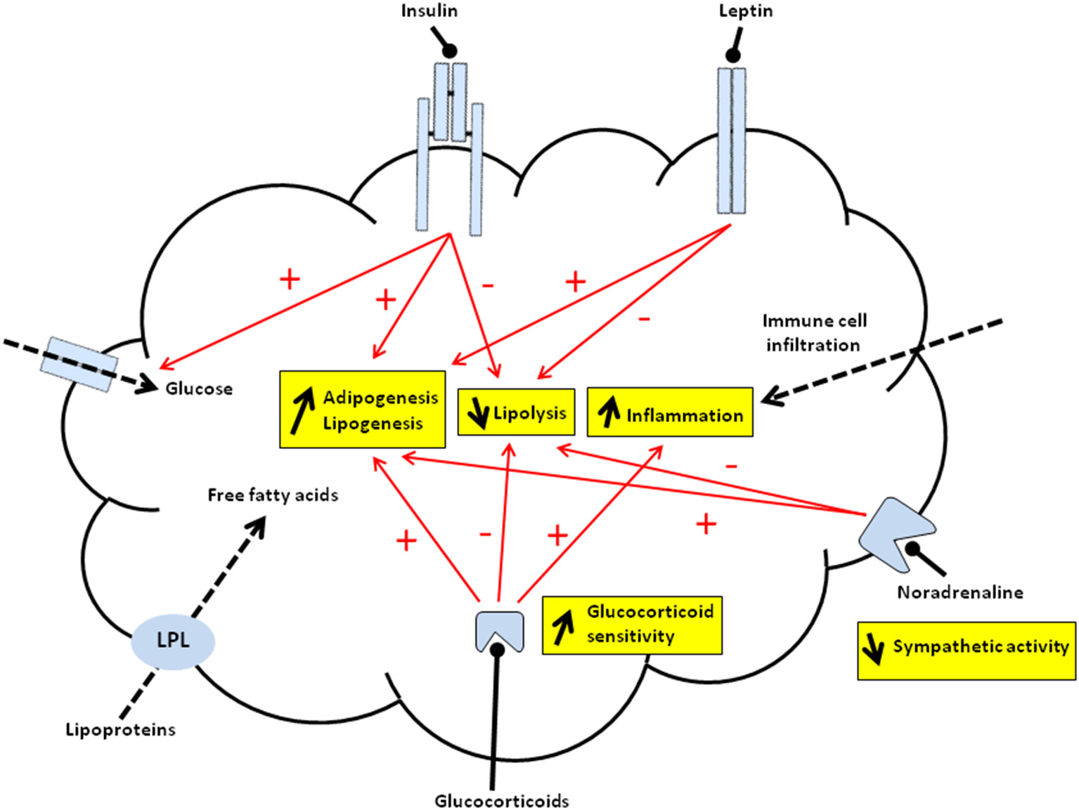 Schematic representation of programmed mechanisms in offspring's adipose tissue of malnourished dams. Overall, offspring from malnourished dams display increased adipogenesis/lipogenesis and inflammation as well as decreased lipolysis within adipose tissue. Red arrows indicate programmed activation (+) or inhibition (−) of major processes controlled by hormones that may predispose offspring to fat accumulation. The accumulation of triglycerides (TG) may be due to increased esterification of either free fatty acids released from lipoproteins, catalyzed by lipoprotein lipase (LPL) (dashed arrow), or free fatty acids synthesized from glucose metabolism mainly driven by lipogenic enzymes. Leptin acting via its receptor (JAK2/STAT3 signaling pathway) may activate preadipocyte proliferation and/or inhibit lipolysis. Insulin after binding to its receptor (IRS/PI3K/Akt signaling pathway) may promote the TG formation via activation of glucose entry (i.e., increased GLUT4 translocation) (dashed arrow) and lipogenic enzymes. Insulin also shows anti-lipolytic effects and may activate adipogenesis. Increased adipogenesis and decreased lipolysis may be due to impaired activity of the sympathetic system (via noradrenaline). Glucocorticoids (GC) that bind intracellular receptor may activate adipogenesis and lipogenesis whereas they inhibit lipolysis. Thus, both increased circulating GC levels and intracellular GC sensivity (i.e., modified GR, MR, 11 β-HSD1, 11 β-HSD2 relative abundance and activities) can directly impact on adipose tissue function. The pro-inflammatory state might be due to either immune cell infiltration (dashed arrow) and/or local expression of pro-inflammatory mediators. The pro-inflammatory state may also originate, at least in part, from increased GC sensitivity within WAT.