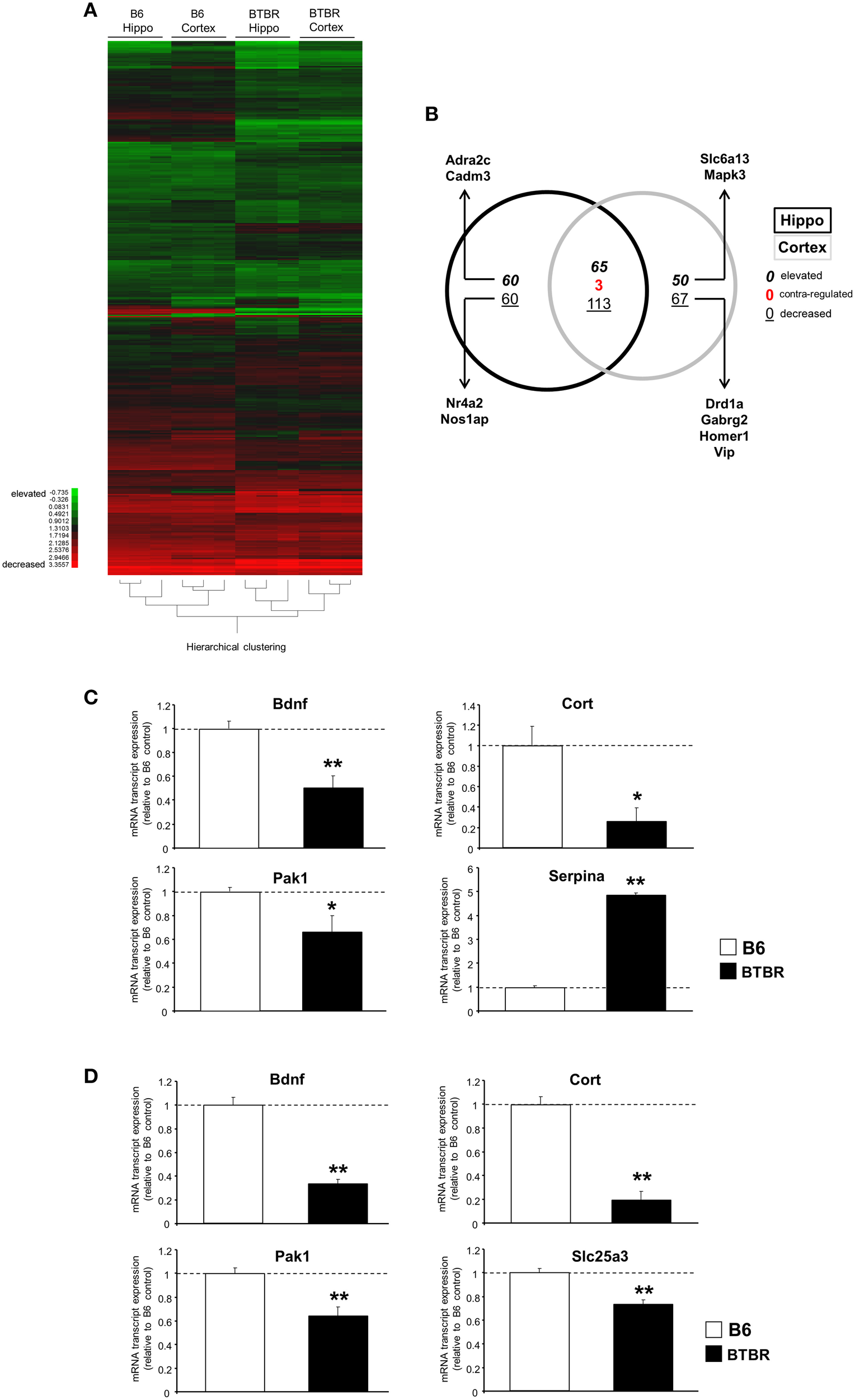 Significant cortical and hippocampal transcriptomic divergence between BTBR and B6 controls. (A) Heatmap of significantly decreased or elevated transcripts in cortical and hippocampal tissues from BTBR mice compared to tissues from B6 controls. Green blocks = decreased; red blocks = elevated. (B) VennPlex diagram of significantly regulated [up- (bold italic), down- (underlined), or contra-regulated (red bold: possessing a diverse expression polarity in different tissues)] transcripts in hippocampal (black line) or cortical (gray line) tissues. Arrows indicate specific transcripts of interest to autistic phenotypes. RT-PCR-mediated validation of significantly-regulated hippocampal (C) and cortical (D) transcripts. Histogram white bars represent B6 data and black bars represent BTBR data.*p ≤ 0.05, **p ≤ 0.01.