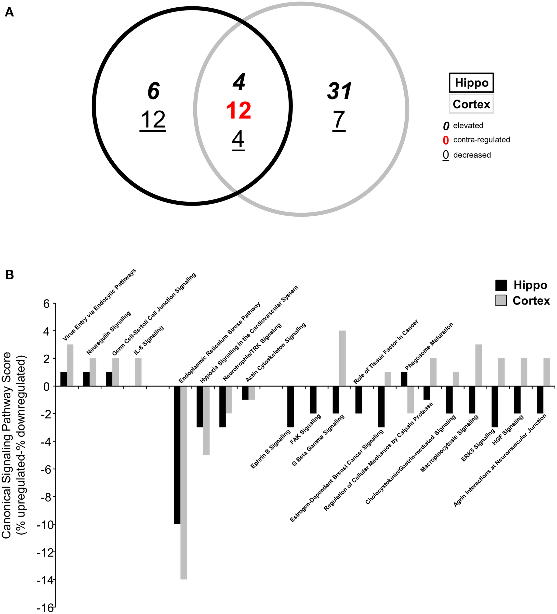 Differential canonical signaling pathway analysis of BTBR-specific hippocampal and cortical transcriptomes. (A) VennPlex representation of IPA canonical signaling pathway annotation of hippocampal (black line) and cortical (gray line) transcriptomic data (VennPlex numerical set description is as described in Figure 1). (B) Differential IPA signaling pathway scores (% elevated transcripts in given pathway minus % decreased transcripts in the given pathway).