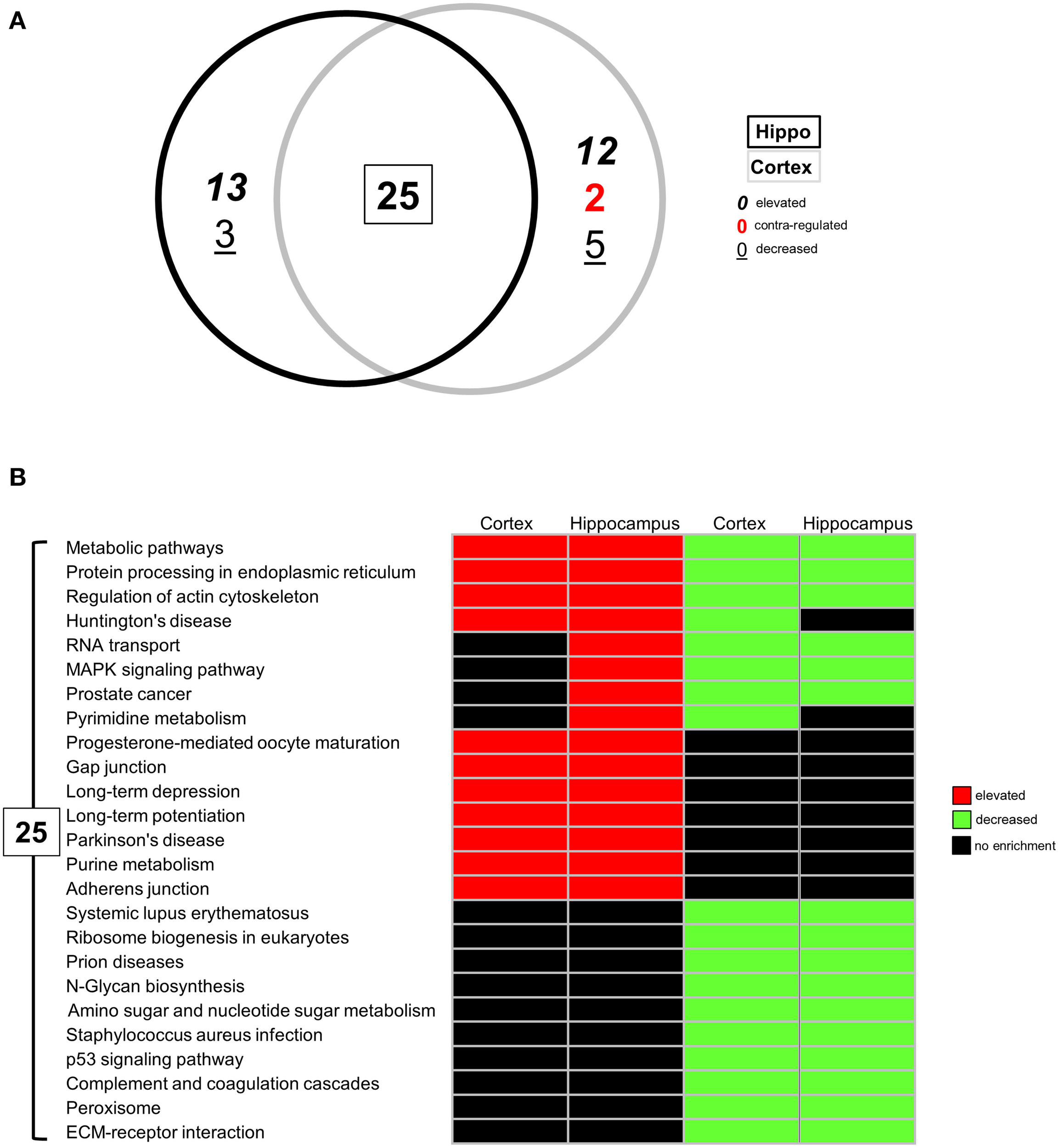 Differential KEGG pathway analysis of BTBR-specific hippocampal and cortical transcriptomes. (A) VennPlex representation IPA canonical signaling pathway annotation of hippocampal (black line) and cortical (gray line) transcriptomic data (VennPlex numerical set description is as described in Figure 1). (B) Differential KEGG pathway population matrix of 25 (A) commonly-controlled pathways between hippocampal and cortical tissues. Differential pathway regulation (elevated—red; decreased—green) was generated using data from up- or downregulated input transcriptomic sub-datasets.
