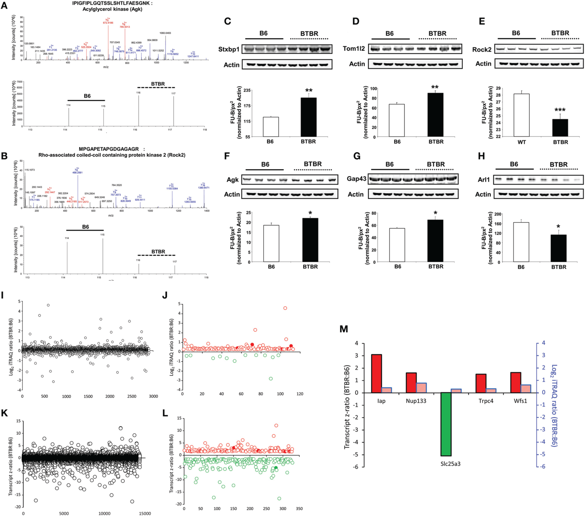 iTRAQ- and transcriptomic-based identification and quantification of BTBR-modulated hippocampal proteins. Identification of hippocampal proteins significantly up-regulated in BTBR mice compared to B6 controls via iTRAQ-based quantitative mass spectrometry. An example of the (A) isolation and identification of Agk MS2 peptide ions (b daughter ions in red, y daughter ions in blue) and below iTRAQ mass tag reporter ions of Agk peptides found to be elevated in BTBR mice compared to B6 controls. An example of the (B) isolation and identification of Rock2 MS2 peptide ions (b daughter ions in red, y daughter ions in blue) and below iTRAQ mass tag reporter ions of Rock2 peptides found to be lower in BTBR mice compared to B6 controls. Western blot validation of alterations in hippocampal protein expression levels. Validation of alterations in hippocampal protein expression levels in BTBR mice compared to B6 controls via Western blotting. Validation of mass spectrometric identification of altered protein expression levels of the following proteins: Stxbp1 (C), Tom1l2 (D), Rock2 (E), Agk (F), Gap43 (G), and Arl1 (H). Protein expression levels were measured as Fluorescent Units-Background fluorescence per square pixel (FU-B/px2) relative to Actin. *p ≤ 0.05, **p ≤ 0.01, ***p ≤ 0.001. White bars represent B6 data and black bars represent BTBR data. (I) Total hippocampal protein expression variation between BTBR and control B6 mice. (J) Reliable and differentially-regulated hippocampal proteins between BTBR and B6 mice (red circles indicated upregulated proteins, green circles indicate downregulated proteins: solid filled circles represent common factors identified at both protein and transcript level). (K) Total hippocampal transcript expression variation between BTBR and control B6 mice. (L) Reliable and differentially-regulated hippocampal transcripts between BTBR and B6 mice (red circles indicated upregulated proteins, green circles indicate downregulated proteins: solid filled circles represent common factors identified at both protein and transcript level). (M) Hippocampal proteins/transcripts commonly identified in both proteomic and microarray analyses. Bars outlined with black lines represent transcriptomic data and those outlined in blue represent proteomic data.