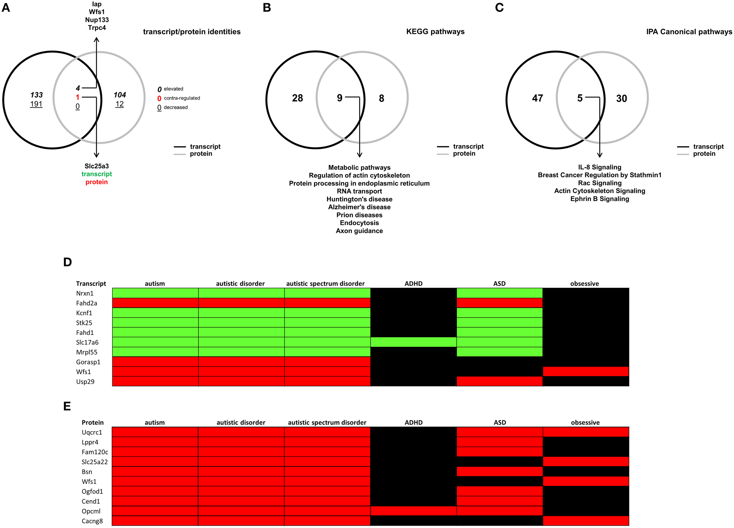 Latent semantic indexing-based interpretations of hippocampal transcript/protein expression patterns. (A) VennPlex representation of BTBR transcript (black line) and protein (gray line) hippocampal expression profiles (VennPlex numerical set description is as described in Figure 1). Slc25a3 was found to be decreased (green text) in the transcript dataset, while elevated (red text) in the protein dataset. Arrows indicate specific transcripts/proteins of interest to autistic phenotypes. (B) VennPlex representation of BTBR transcript (black line) and protein (gray line) hippocampal KEGG pathway annotation profiles. Arrows indicate specific KEGG pathways common to both datasets. (C) VennPlex representation of BTBR transcript (black line) and protein (gray line) hippocampal IPA canonical signaling pathway annotation profiles. Arrows indicate specific KEGG pathways common to both datasets. (D) Latent Semantic Indexing (LSI) interrogation matrix of significantly-regulated hippocampal transcripts (Top 10 correlating transcripts) extracted using input autism-related search terms (autism—autistic disorder—autistic spectrum disorder—ADHD—ASD—obsessive). (E) Latent Semantic Indexing (LSI) interrogation matrix of significantly-regulated hippocampal proteins (Top 10 correlating proteins depicted) extracted using input autism-related search terms (autism—autistic disorder—autistic spectrum disorder—ADHD—ASD—obsessive). Green block = decreased; Red = elevated; black = no correlation identified.
