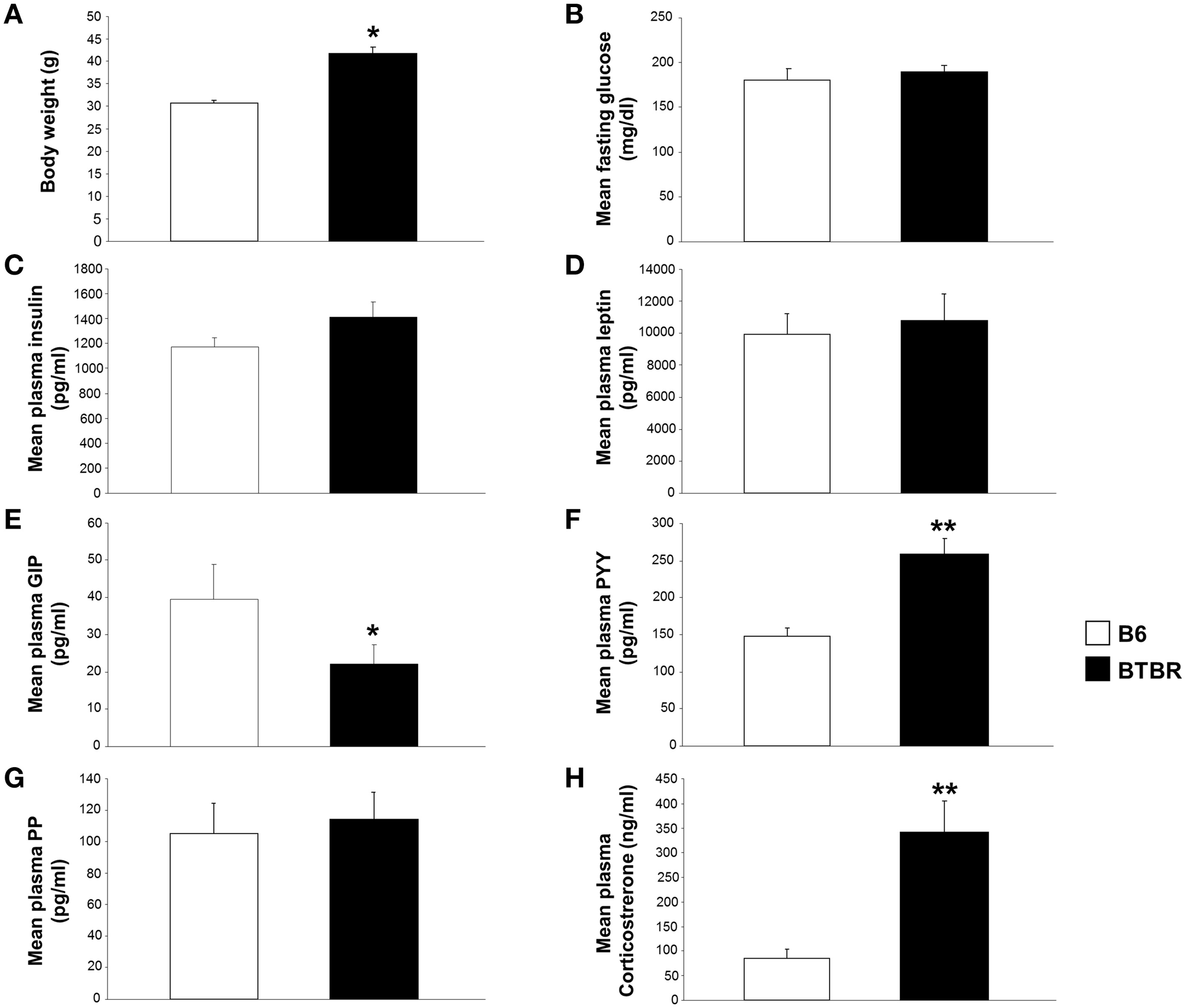 Significant alterations in body weight, and gut and metabolic hormones in BTBR mice compared to B6 controls. Significant alterations in body weight, and gut and metabolic hormones in BTBR mice compared to B6 mice. (A) Alterations in body weight in BTBR mice compared to B6 controls. Alterations in fasting glucose (B), plasma insulin (C), leptin (D), GIP (E), peptide YY (F), pancreatic polypeptide (G), and corticosterone levels (H) in BTBR mice compared to B6 controls. *p ≤ 0.05, **p ≤ 0.01. Histogram white bars represent B6 data and black bars represent BTBR data.