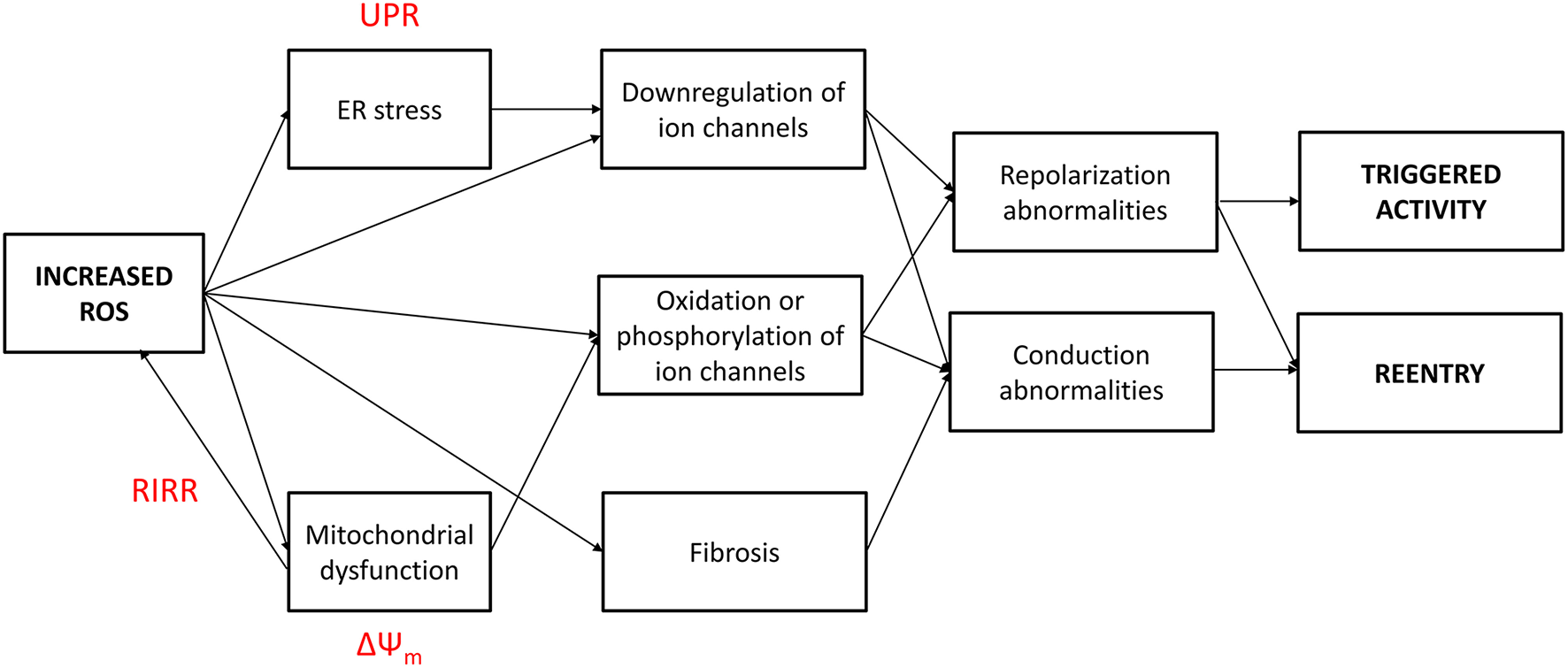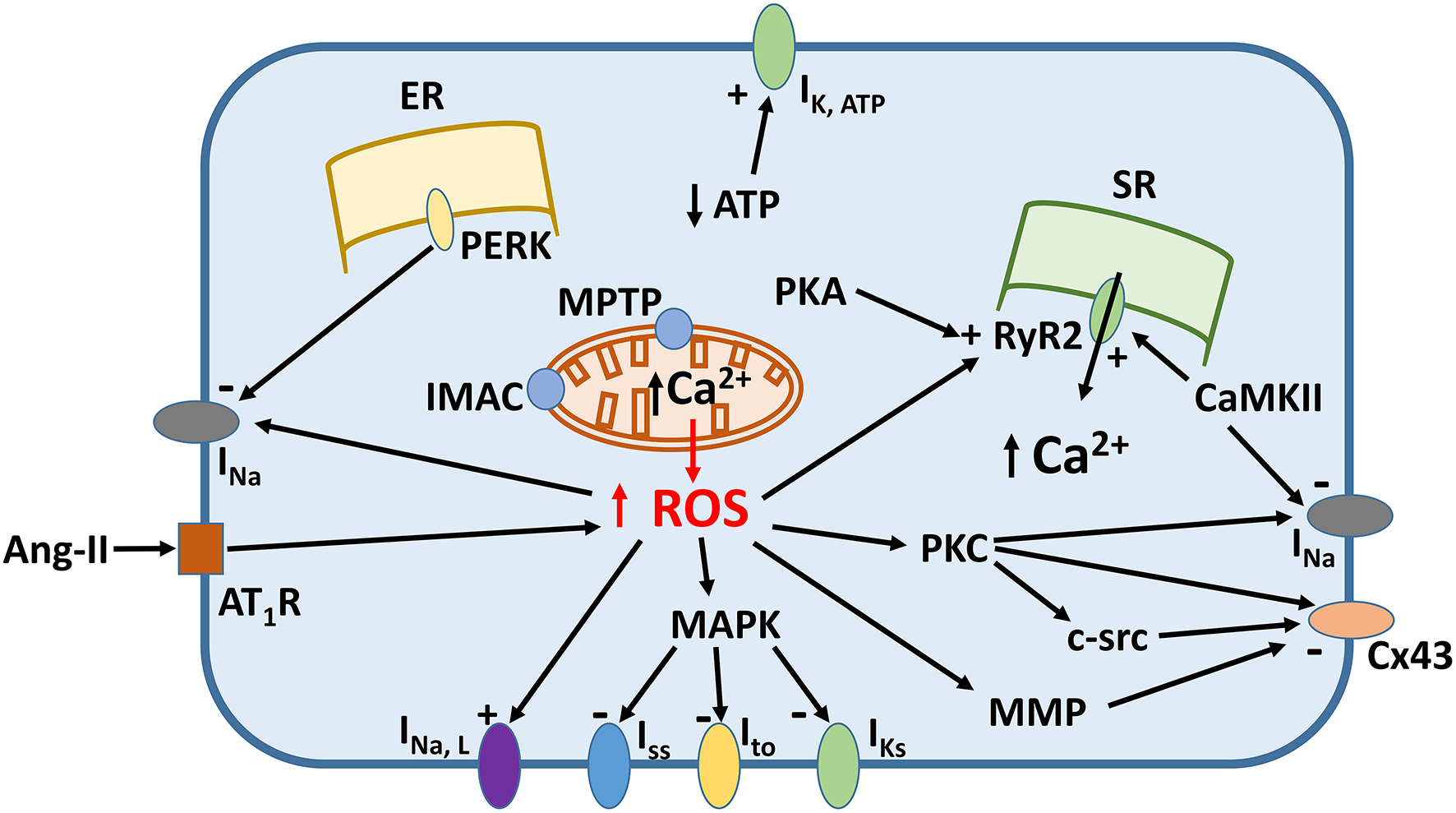 Results: Prolonged endoplasmic reticulum stress is observed in heart failure, leading to increased production of ROS. Mitochondrial ROS, which is elevated in diabetes and hypertension, can stimulate its own production in a positive feedback loop, termed ROS-induced ROS release. Together with activation of mitochondrial inner membrane anion channels, it leads to mitochondrial depolarization. Abnormal function of these organelles can then activate downstream signaling pathways, ultimately culminating in altered function or expression of cardiac ion channels responsible for generating the cardiac action potential (AP). Vascular and cardiac endothelial cells become dysfunctional, leading to altered paracrine signaling to influence the electrophysiology of adjacent cardiomyocytes. All of these changes can in turn produce abnormalities in AP repolarization or conduction, thereby increasing likelihood of triggered activity and reentry.