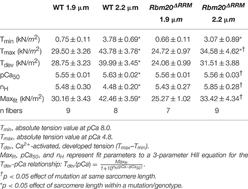 Table 1. Characteristics of tension-pCa relationships in mouse myocardium at 1.9 and 2.2 μm sarcomere lengths, with and without Rbm20ΔRRM mutation (mean ± SEM).