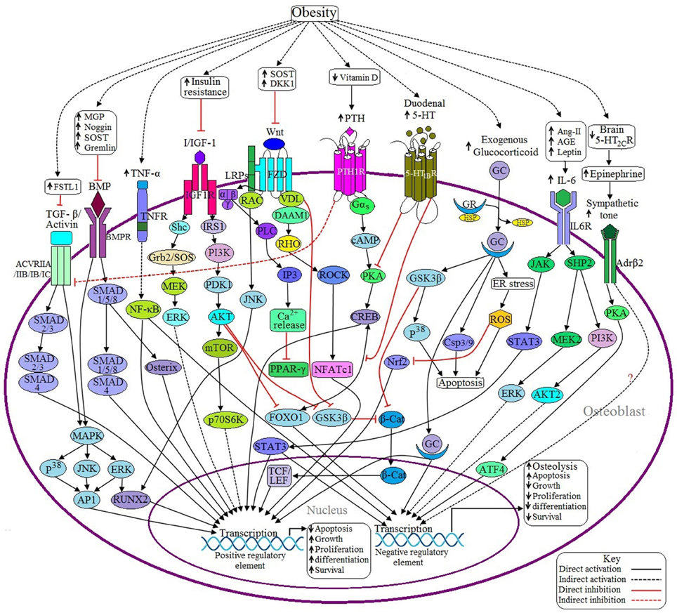 Figure 2. Possible adverse effects of obesity on osteoblasts. (a) Anabolic pathways: Binding of BMP with BMPR induces SMAD dependent and SMAD independent pathways and ultimately transcribes the genes required for osteoblast formation. In the case of SMAD dependent signaling, activation of SMAD1/5/8 recruits SMAD4 to form a SMADs complex, which in turn transcribes particular gene/genes. SMAD 1/5/8 also activates specific genes via Osterix (Osx) mediated signaling. In case of SMAD independent signaling, activated BMPR induces the transcription factor runt-related transcription factor 2 (RUNX2) and activator protein 1 (AP1) to be activated through P38MAPK/JNK/ERK signaling pathway. Obesity inhibits BMP signaling by upregulating the expression of some BMP inhibitors like MGP, Noggin, SOST, and Gremlin. TGF-β/Activin may activate several receptor subtypes including ACVRIIA, ACVRIIB, ACVRIB, and ACVRIC. Like BMP signaling, Activin also signals through SMAD dependent and SMAD independent pathways, but the main difference is that Activin induces SMAD2/3 and then recruits SMAD4 to form a SMADs complex. Obesity decreases Activin signaling via upregulating the expression of follistatin-like 1 (FSTL1), a potential inhibitor of Activin signaling. Binding of canonical with Frizzled/Lipoprotein receptor-related proteins (FZD/LRPs) complex activates vessel dilator (VDL), which in turns prevents β-catenin (β-cat) degradation as well as subsequent translocation of β-cat into the nucleus to activate T cell factor/lymphoid enhancer factor (TCF/LEF) by sequestering Glycogen synthase kinase 3 β (GSK3β). Binding of non-canonical Wnt with FZD triggers three different signaling pathways: (1) FZD recruits LRP and disheveled associated activator of morphogenesis 1 (DAAM1) to form a complex, which in turns activates the gene via RHO/ROCK/NFATC1 signaling pathway; (2) VDL forms a complex with Rac to activate RUNX2 via c-Jun NH2-terminal kinase (JNK) activation; and (3) Activated FZD induces the activation of G protein, which in turn activates Phospholipase C (PLC) to generate inositol-1,4,5-trisphosphate (IP3) to increase the cytosolic Ca2+ concentration and these Ca2+ act as negative regulators of peroxisome proliferator activated receptor γ (PPAR-γ). Obesity decreases Wnt signaling by upregulating the expression of Wnt inhibitors like SOST and Dickkopf Wnt Signaling Pathway Inhibitor 1 (DKK1). Upon activation of IGF-1 receptor (IGF-1R) by I/IGF-1 transcribes the corresponding genes through PI3K/AKT signaling and MAPK signaling pathways. Activated protein kinase B (AKT) also inhibits Forkhead box O1 (FOXO1) and GSK3β resulting in decreased expression of negative regulatory elements. Obesity-induced insulin resistance (IR) decreases I/IGF signaling. (b) Catabolic pathways: Decreased level of 5-HT from the brain suppresses bone formation by facilitating the activation of β2 adrenergic receptor (Adrβ2), which transcribes Cyclin D1 (CycD1) inhibitory factor through PKA/ATF4 signaling pathway. Adrβ2 also upregulates the expression of receptor activator of nuclear factor kappa-β ligand (RANKL) through an unknown pathway. Obesity is inversely related to brain 5-HT2CR expression. PTH signaling has both positive and negative impacts on osteoblast development. Activated parathyroid hormone 1 receptor (PTH1R) induces the activation of G protein, which in turn activates positive regulatory elements via cAMP/PKA/CREB signaling pathway although cAMP response element binding protein (CREB) requires the recruitment of FOXO1 to be activated. PTH1R also inhibits Activin/TGF-β signaling by inhibiting the Activin receptor (ACVR). Obesity causes the elevation of PTH via decreasing vitamin D synthesis. Duodenal 5-HT decreases PTH signaling by inhibiting protein kinase A (PKA) as well as preventing the recruitment of FOXO1 with CREB resulting in decreased osteoblastogenesis. Obesity upregulates duodenal 5-HT expression. GC binds with the glucocorticoid receptor (GR) to form the GC-GR activation complex, which induces osteoblast apoptosis through GSK3β/P38 signaling, generation of reactive oxygen species (ROS) by endoplasmic reticulum (ER) stress and via activation of caspase 3/9 (Csp3/9). In addition, GSK3β inhibits β-cat activity and ROS inhibits Nuclear factor-like 2 (Nrf2), a positive regulator of osteoblast. Sometimes GC activates the positive regulatory elements too. Excess GC uptake is associated with obesity. IL-6 induced JAK/STAT3 signaling has both positive and negative effects on osteoblast. In addition, IL-6 exerts its negative role via SHP2/PI3K/AKT signaling and via SHP2/MEK2/ERK signaling pathways. Obesity induces IL-6 upregulation through increased generation of Ang II, AGE and leptin. TNF-α activated TNF receptor (TNFR) activates nuclear factor-κB (NF-κB), which has both negative and positive roles in osteoblastogenesis. Obesity is responsible for increased synthesis of TNF-α.