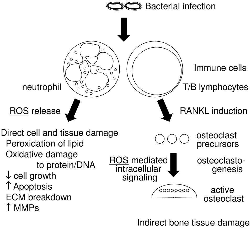 Diagram of the relationship between periodontitis and reactive oxygen species (ROS). Infections with periodontopathogenic bacteria induce host immune responses, which includes neutrophil and T/B lymphocyte activation. Activated neutrophils generate ROS that have an anti-bacterial effect and are thus a form of host defense. Excessive ROS, however, result in direct cell and tissue damage, which includes (1) peroxidation of lipids, (2) oxidative damage to protein and DNA, (3) decrease of cell growth, (4) increased apoptosis, (5) breakdown of the extracellular matrix (ECM), (6) induction of matrix metalloproteases (MMPs). Activated T/B lymphocytes induce RANKL in periodontal tissue, which results in the augmentation of osteoclastogenesis. Some ROS work as intracellular signaling molecules in RANKL stimulation.