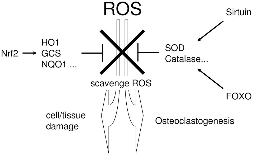 The linking the periodontitis, the regulatory pathways of ROS scavenging enzymes, and the defense mechanism against tissue destruction. Excessive ROS exhibit cytotoxicity and induce tissue destruction in periodontal tissue. To protect such ROS-mediated cytotoxicity, cells possess several regulatory pathways which regulate the production of cytoprotective enzymes that scavenge ROS. NRF2, Sirtuin, and FOXO are situated in the major regulatory pathways for cytoprotective enzyme production.