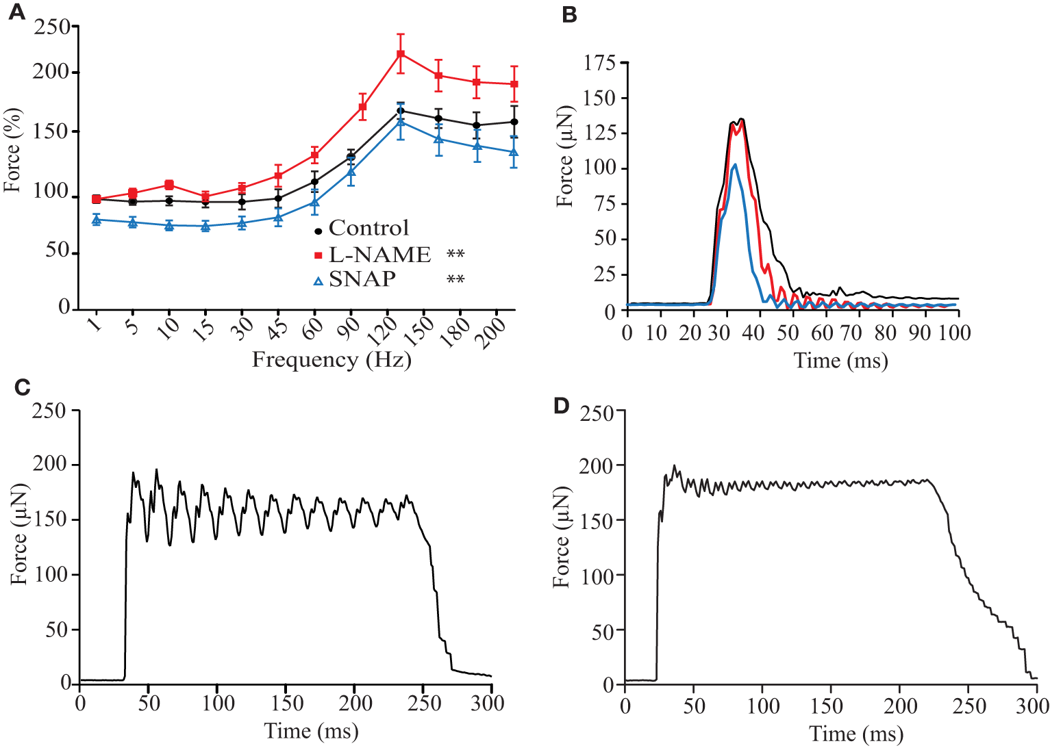 In order to understand the role of NO on the basic response of muscle contraction of zebrafish, the force-frequency relationship was obtained from electrically stimulated decapitated fish using a voltage-time protocol (18 V, 2 ms during 200 ms every 2 min) in control solution only or with addition of an unspecific NOS blocker (L-NAME) or the NO donor (SNAP) compared to control solution (Figure 1A). Since the standard procedure of normalization using the cross-sectional area was not possible, single twitch force response under control solution and previous the experimental protocols described above was recorded. This value was used to normalized the force-frequency relationship under the effect of SNAP or L-NAME. In general, force production did neither increase steeply with the increase of stimulation frequency, nor was a stable plateau reached at high frequencies of stimulations as observed in mammals. In control solution, normalized force production was around 67% at maximum simulation frequency (Figure 1A). Single twitch stimulation showed a typical response (Figure 1B). Interestingly, we did not observe a fused tetanus at 120 Hz as reported in mammals at these high frequencies of stimulation (Figure 1C), but only at 200 Hz (Figure 1D). The two-way ANOVA analysis showed a significant interaction between frequency and the treatment with L-NAME and SNAP (F = 2.22 DF22; 165; p < 0.0024). Normalized force production under the effect of L-NAME was not different from control at low and medium stimulation frequency (from 1 to 60 Hz). However, at high frequency of stimulation (90–200 Hz), the force was higher (Figure 1A). In presence of SNAP, the normalized force was lower compared to control from 1 to 60 Hz of stimulation and no difference was noted above 90 Hz. A similar effect was observed with a different NO donor, 1 μM DEA- NONOate, at the concentration that releases similar amounts of NO as SNAP (data not shown).