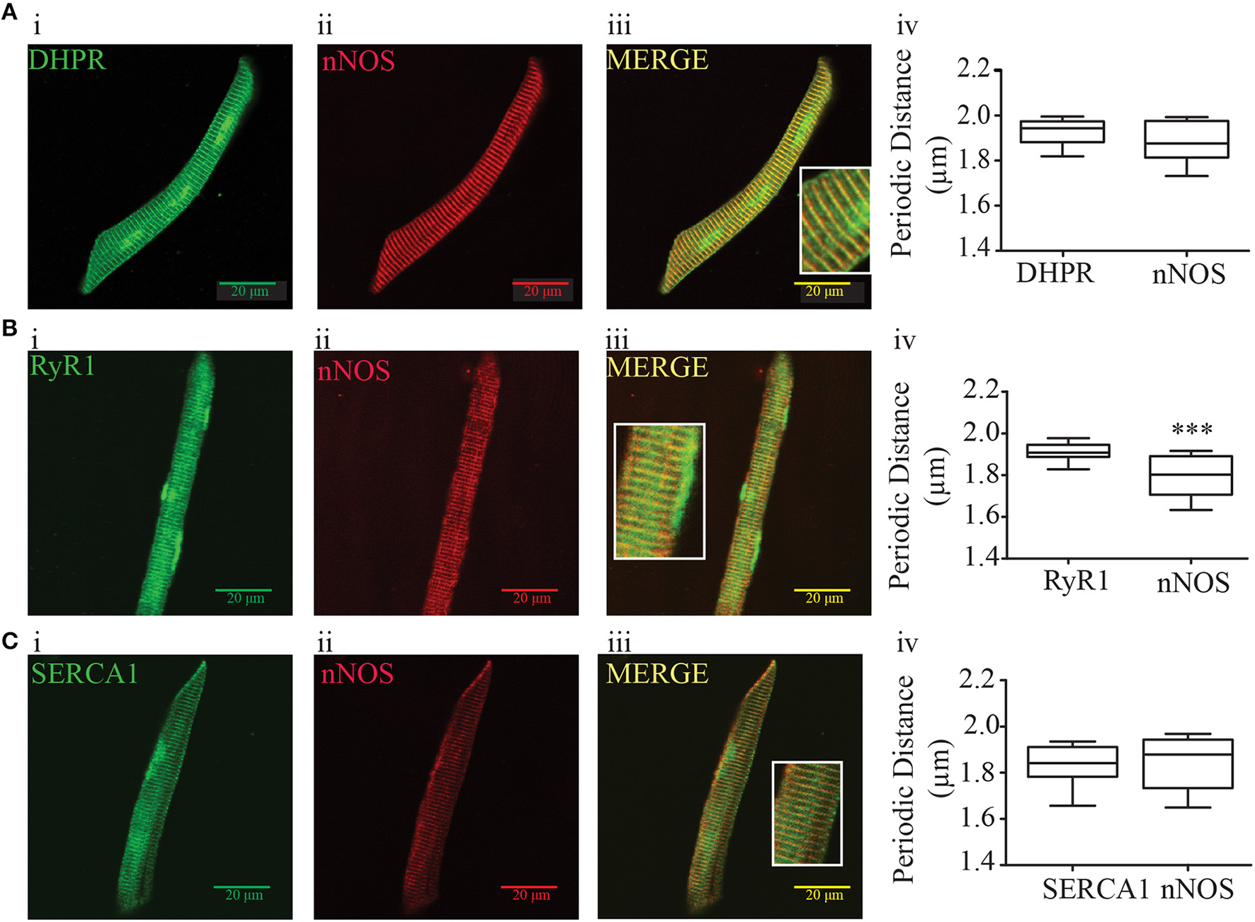 Immunofluorescence and periodic distance analysis of DHPR, RyR, SERCA, and nNOS from zebrafish isolated myocytes. (A) Immunofluorescence for DHPR (i), nNOS (ii), and merge (iii), and periodic distance analysis (iv) from 26 cells. (B) Immunofluorescence for RyR (i), nNOS (ii), and merge (iii), and periodic distance analysis (iv) from 18 cells. (C) Immunofluorescence for DHPR (i), nNOS (ii), and merge (iii), and periodic distance analysis (iv) from 16 cells. The insert at the merged picture shows a magnification of the respective picture. Values are expressed as median; 25–75%. ***p < 0.001 vs. RyR immunofluorescence.