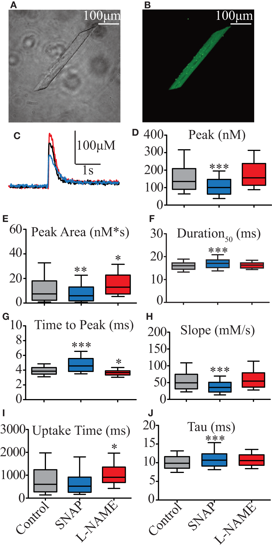 Effect of NO on biophysical parameters of isolated zebrafish myocyte Ca2+ transients. (A) Photomicrography of isolated zebrafish myocytes under light microscope. (B) Photomicrography of the same myocyte shown in (A) loaded with 10 μM Fluo4-AM and seen under fluorescence microscope. (C) Representative Ca2+ transient's traces obtained from electrical field stimulation. Control represented in black, 00 μM SNAP in blue, and 5 mM L-NAME in red. Statistical analyses of Ca2+ transients' biophysical parameters: (D) Peak (nM), (E) Duration50 (ms), (F) Peak Area (nM*s), (G) Time to Peak (ms), (H) Slope (μM/s), (I) Uptake Time (ms), and (J) Tau (s). Values are expressed as median; 25–75%. *p < 0.05, **p < 0.01, ***p < 0.001 vs. control; n = 278 cells for control, 153 cells for SNAP and 106 cells for L-NAME.