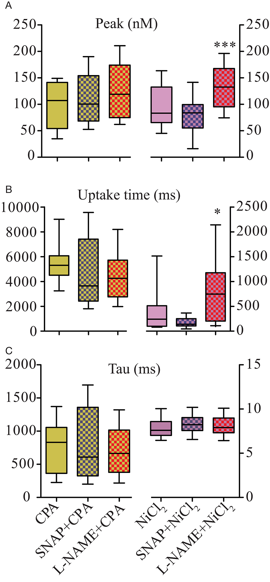 SERCA Ca2+ uptake biophysical parameters of isolated zebrafish myocytes were negatively modulated by NO. Statistical analyses of Ca2+ release parameters from electrically field stimulated isolated myocytes under SNAP (100 μM) or L-NAME (5 mM) in combination with CPA (2.5 μM) on the left or NiCl2 (2 mM) on the right. (A) Peak (nM), (B) Uptake Time (ms), and (C) Tau (s). Values are expressed as median; 25–75%. *p < 0.05; ***p < 0.001, vs. NiCl2; n = 19 cells for CPA, 14 cells for CPA + SNAP, 16 cells for CPA + L-NAME, 54 cells for NiCl2, 22 cells for NiCl2 + SNAP and 19 cells for NiCl2 + L-NAME.