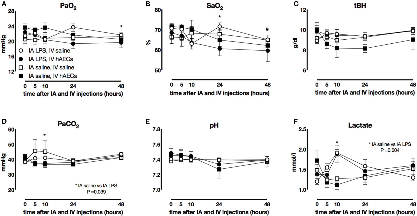 Fetal blood gases. Fetal PaO2(A) decreased over time in groups that received IV hAECs (*P = 0.019), as did SaO2 (B: *P = 0.04; #P < 0.005). Total hemoglobin concentrations (C) were not significantly different between groups. Fetal PaCO2(D) demonstrated a transient increase in groups that received IA LPS compared to IA saline and a significant interaction between time and IV hAECs. Fetal pH (E) was not significantly different between groups. Fetal blood (F) lactate concentrations demonstrated a transient increase in groups that received IA LPS injections. Data are expressed as mean ± SEM.