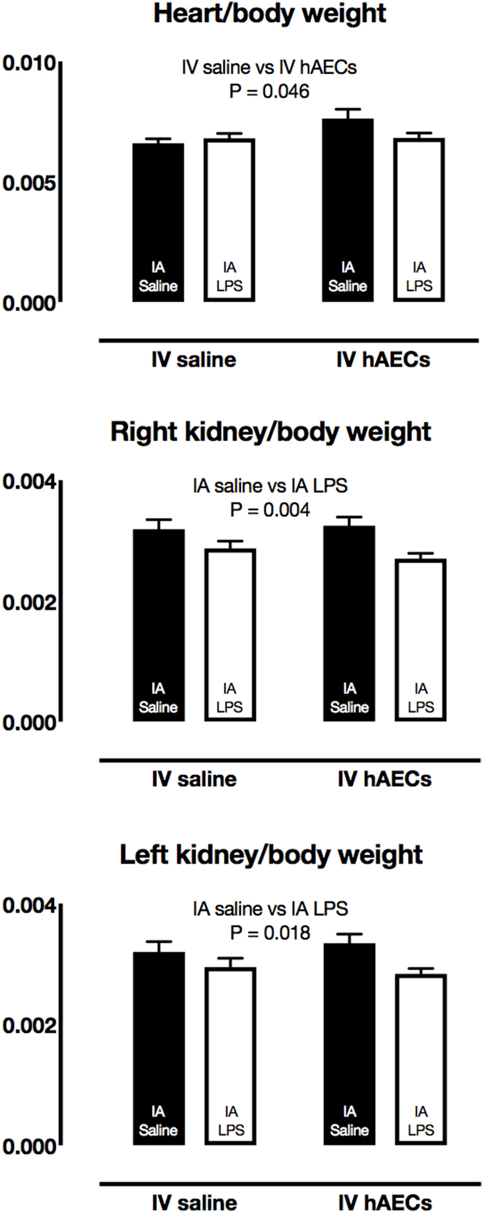 Fetal organ/body weight ratios. Fetal heart/body weight ratios were higher in IV hAECs groups than in IV saline groups (A: P = 0.046), whereas right (B) and left (C) kidney/body weight ratios were lower in groups that received IA LPS than IA saline groups (P = 0.004 and 0.018, respectively). Data are expressed as mean ± SEM.