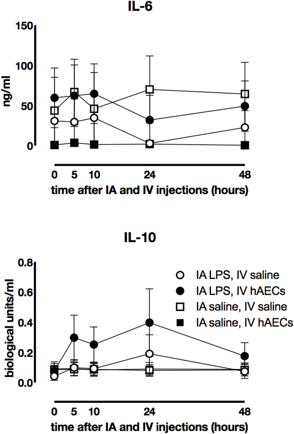 Effect of IA LPS and IV hAECs on systemic cytokine expression. Fetal plasma IL-6 (A) and IL-10 (B) concentrations were not significantly different between groups. Data are expressed as mean ± SEM.