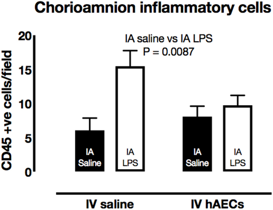 Effect of IA LPS and IV hAECs on expression of inflammatory cells in the chorioamnion. The number of CD45-positive cells per field of view was higher in chorioamnion from groups given IA LPS compared to groups that received IA saline. Data are expressed as mean ± SEM.