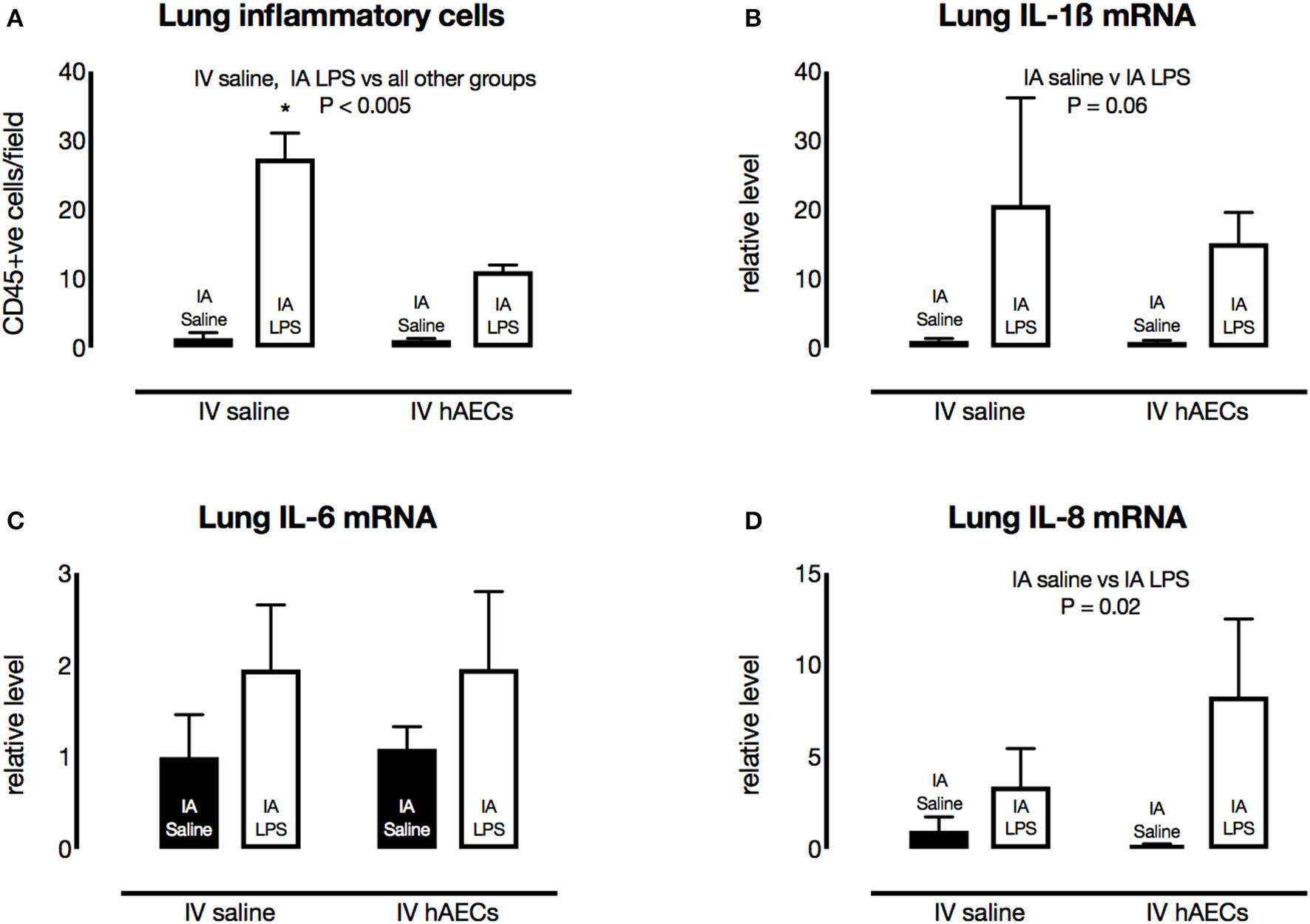 | IA saline + IV saline | IA saline + IV hAECs | IA LPS + IV saline | IA LPS + IV hAECs | |