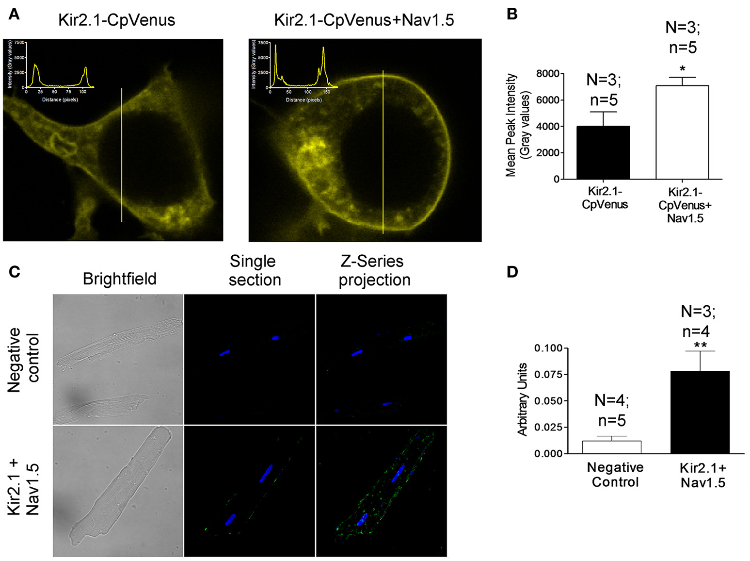 Kir2.1 and Nav1.5 channels are in close proximity at the membrane of cardiac myocytes. (A) Confocal microscopy images of HEK293 cells expressing Kir2.1-CpVenus alone (left) or in the presence of Nav1.5 (right). The insets show the intensity of the signal emitted by CpVenus throughout the cell region selected (yellow line). (B) Peak mean signal corresponding to the cell membrane in cells expressing Kir2.1-CpVenus with or without Nav1.5 channels. (C) Confocal microscopy images of rat ventricular myocytes processed using Duolink® PLA. The green signal demonstrates a physical interaction between Nav1.5 and Kir2.1. Cell nuclei were visible by DAPI staining (blue). (D) Mean intensity of the green signal in the negative control and in the presence of Nav1.5+Kir2.1 antibodies. In (B,D), each bar represents the mean ± SEM of “n” cells of “N” preparations. *P < 0.05 vs. Kir2.1-CpVenus alone. **P < 0.01 vs. negative control.