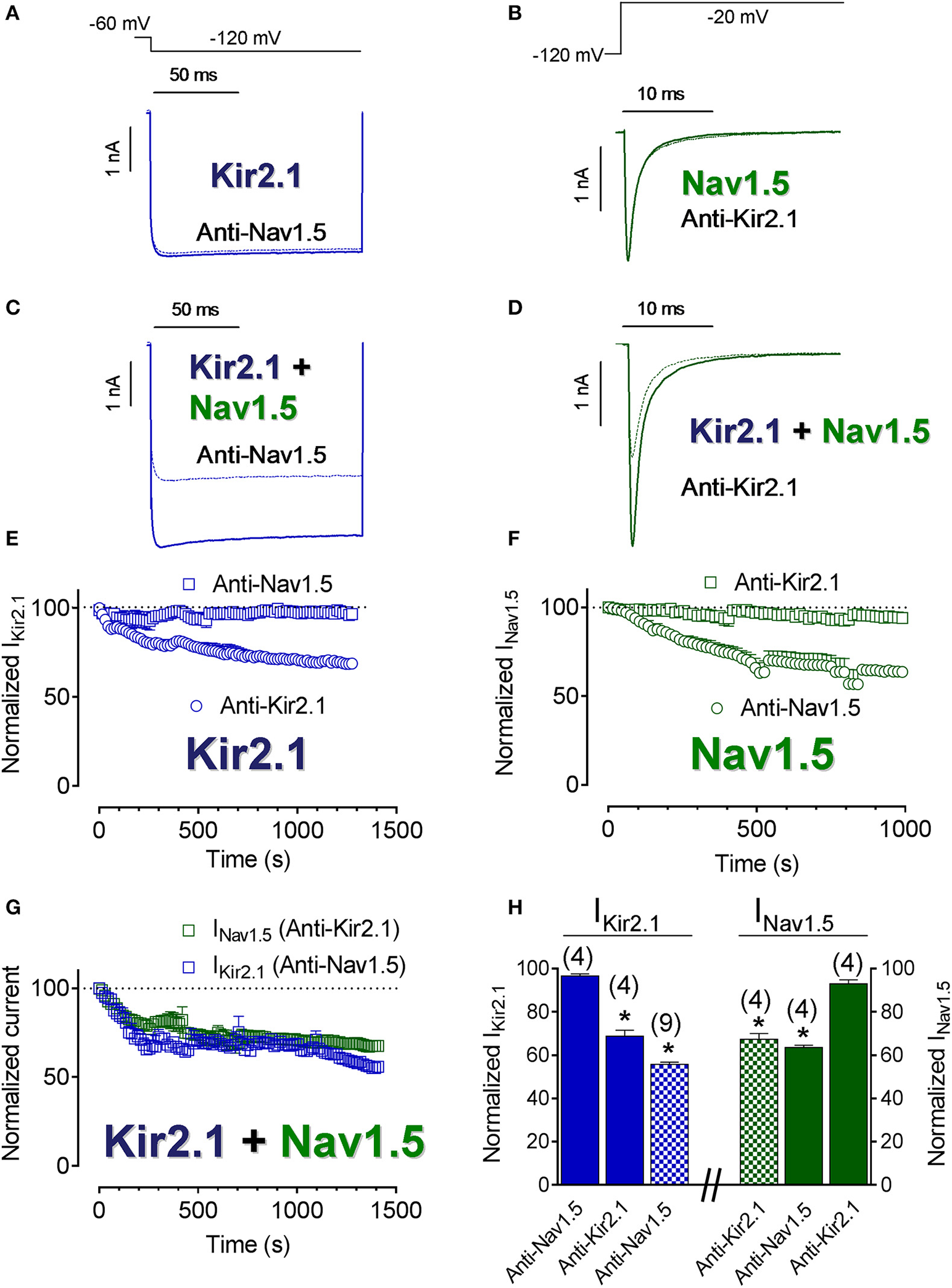 Kir2.1 and Nav1.5 channels closely interact at the cell membrane. (A–D) IKir2.1(A,C) and INav1.5(B,D) traces recorded by applying the protocols shown at the top in CHO cells expressing Kir2.1 or Nav1.5 channels alone (A,B) or together (C,D) in control conditions (solid lines) or after dialyzing the cell with the antibodies indicated (dashed lines). (E–G) Normalized IKir2.1 (measured at −120 mV) (E,G) and peak INav1.5(F,G) measured in the absence and presence of anti-Kir2.1 or anti-Nav1.5 antibodies in cells transfected with Kir2.1 or Nav1.5 channels alone (E,F) or cotransfected with both (G) plotted as a function of time. (H) Bar graphs showing the mean normalized current density values measured in each experimental group at the end of the recordings. Each point/bar represents the mean ± SEM of (n) cells of ≥ 3 preparations. In (H), *P < 0.05 vs. IKir2.1 or INav1.5 generated by Kir2.1 or Nav1.5 channels alone in the presence of anti-Nav1.5 or anti-Kir2.1 antibodies. For clarity the results of other statistical comparisons were not shown.