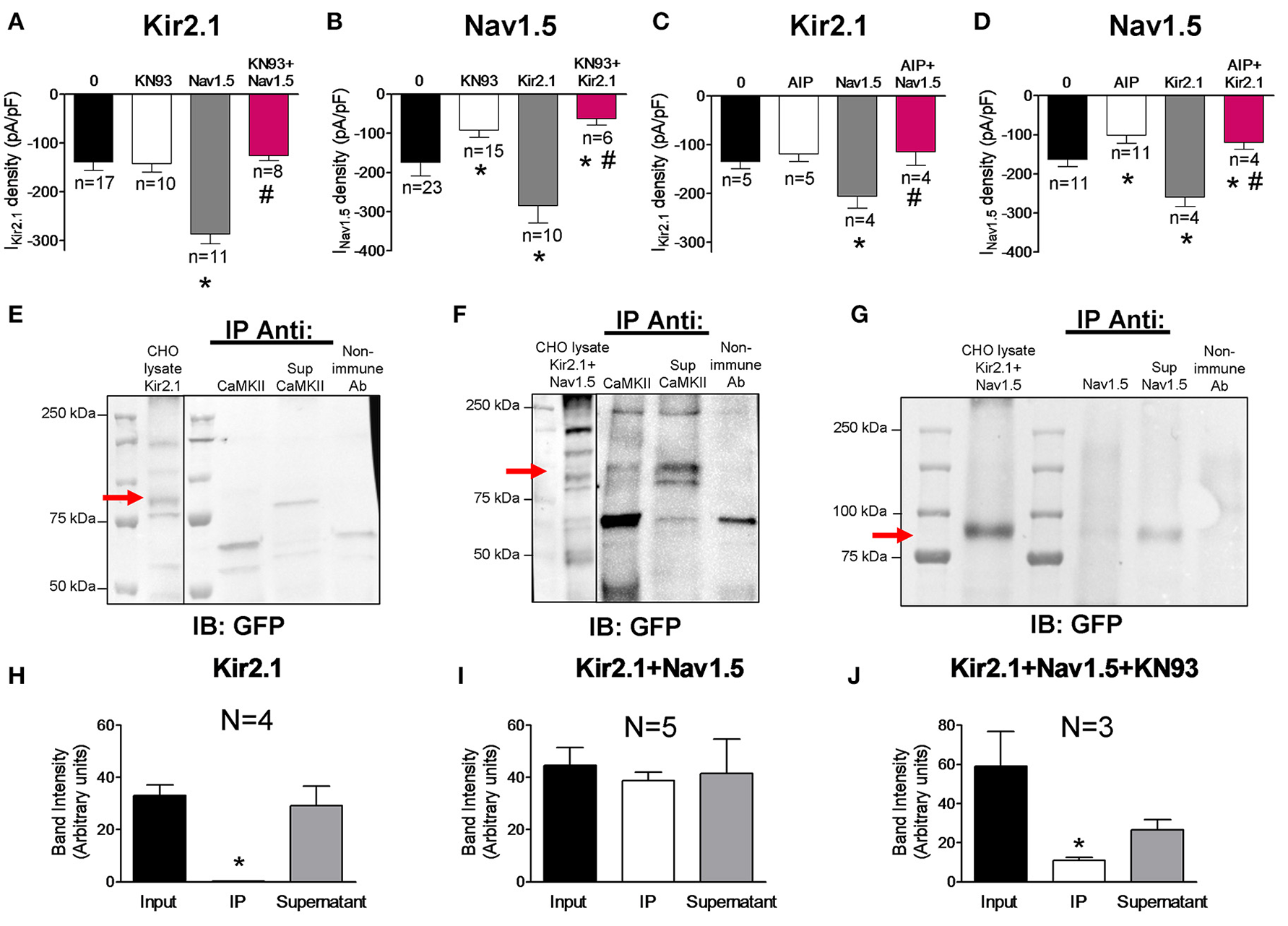 It is well-established that Nav1.5 channels are one of the most important targets of CaMKII in cardiac myocytes (Wagner et al., 2006; Ashpole et al., 2012; Herren et al., 2015). Electrophysiological studies in HEK-293 cells have demonstrated that the kinase phosphorylates residues located in the cytoplasmic loop between domains I and II of the channel leading to an increase of the late INa (INaL) and to a shift of the voltage-dependence of Nav1.5 channel inactivation to hyperpolarized potentials (Ashpole et al., 2012). To analyze the modulatory role of CaMKII on the channels expressed separately or together, we recorded the IKir2.1 and INav1.5 in cells transfected with the channels and incubated or not with the CaMKII inhibitor KN93 (1 μM) for 24 h. Under our experimental conditions, inhibition of CaMKII did not modify IKir2.1 in cells transfected with Kir2.1 alone (n ≥ 10; P > 0.05; Figure 3A) whereas it significantly decreased the INav1.5 in cells transfected with Nav1.5 channels alone (P < 0.05; Figure 3B). Furthermore, inhibition of the CaMKII-dependent phosphorylation significantly decreased the INaL recorded at the end of 500 ms pulses and shifted the inactivation curve to depolarized potentials (Supplemental Figure 2). Coexpression of Nav1.5 and Kir2.1 channels markedly and significantly increased both IKir2.1 (Figure 3A) and INav1.5 (Figure 3B) (gray bars) as a consequence of the reciprocal positive modulation (Milstein et al., 2012; Matamoros et al., 2016), and the INaL (Supplemental Figure 2). Interestingly, in cells cotransfected with Kir2.1 and Nav1.5 channels simultaneously, incubation with KN93 significantly reduced the INav1.5 (Figure 3B) and INaL as expected (Supplemental Figure 2), and, unexpectedly, it also reduced the IKir2.1 compared to that generated in cotransfected cells in which CaMKII was not inhibited (Figure 3A). In another group of experiments CaMKII was inhibited with autocamtide-2-related inhibitory peptide (AIP) which was added to the “internal” solution that dialyzes the cells after the patch rupture (1 nM). Data presented in Figures 3C,D and Supplemental Figure 2 confirmed that CaMKII inhibition significantly decreased the INav1.5 and the INaL in cells expressing Nav1.5 channels either alone or in the presence of Kir2.1 channels. Conversely, CaMKII inhibition only decreased the IKir2.1 generated in cells cotransfected with Kir2.1 and Nav1.5 channels. Overall the results suggest that when both Kir2.1 and Nav1.5 channels are expressed together, a pool of Kir2.1 channels, probably those that are interacting with Nav1.5 channels, becomes a target for CaMKII (Figures 3B,D). To test this hypothesis co-immunoprecipitation experiments with Kir2.1-CpVenus channels cotransfected or not with Nav1.5 were conducted. As can be observed in Figures 3E,H, and consistently with the electrophysiological results, in cells expressing Kir2.1-CpVenus alone CaMKII did not co-immunoprecipitate with Kir2.1 channels, that were detected in the supernatant fraction by means of anti-GFP antibody which recognizes CpVenus. Conversely, CaMKII partially co-immunoprecipitated with Kir2.1 in cells cotransfected with both Kir2.1 and Nav1.5 channels (Figures 3F,I). The results pointed to a relevant role of CaMKII in the reciprocal positive modulation between Kir2.1 and Nav1.5 channels. Thus, we conducted co-immunoprecipitation experiments in cells cotransfected with Nav1.5 and Kir2.1 and incubated with KN93. Under these conditions Kir2.1-CpVenus channels did not co-immunoprecipitate with Nav1.5 channels (Figures 3G,J).