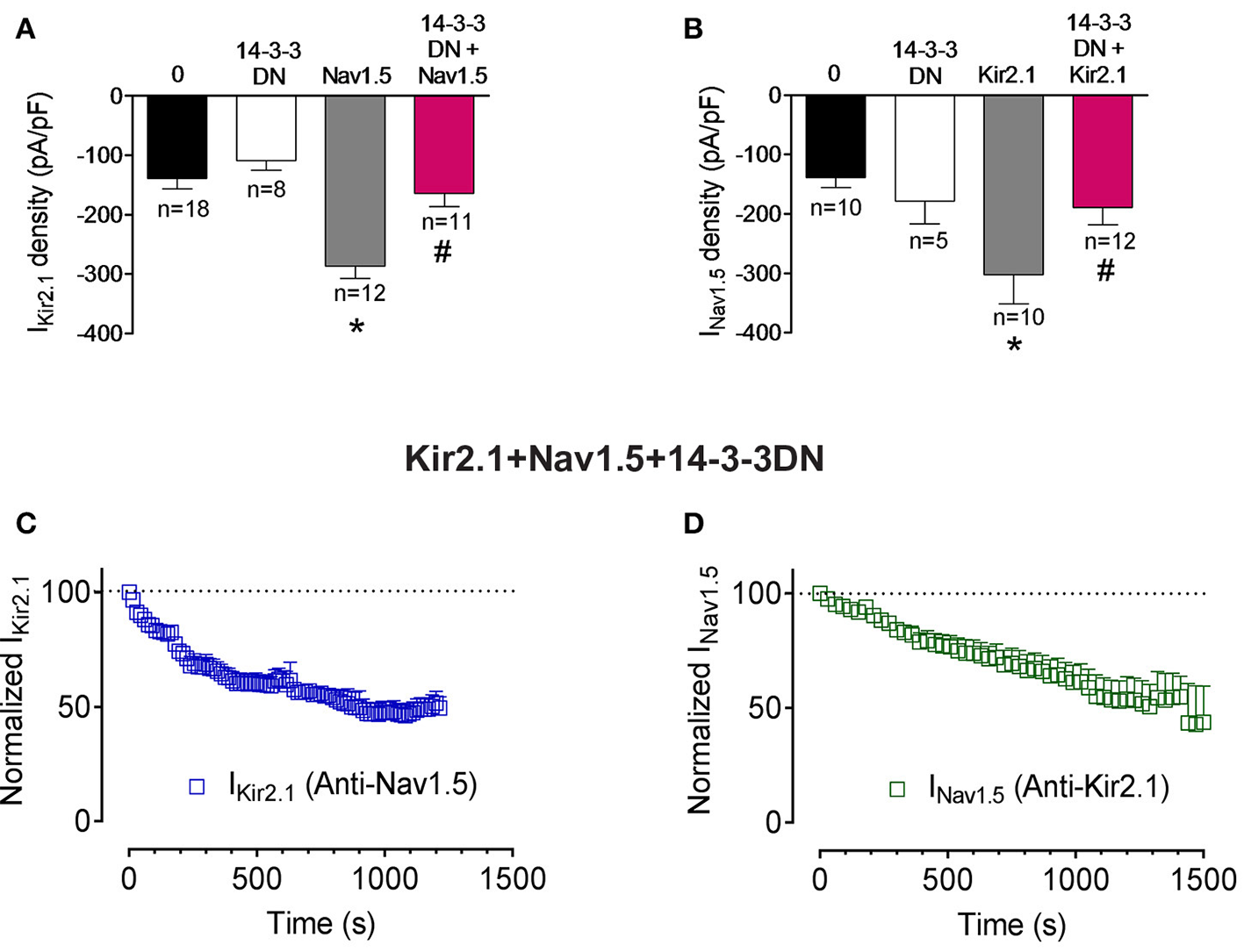 Effects of 14-3-3 inhibition on Kir2.1-Nav1.5 channel complexes. (A,B) IKir2.1 density at −120 mV (A) and peak INav1.5(B) recorded in CHO cells expressing the constructs indicated, cotransfected or not with 14-3-3DN. Each bar represents the mean±SEM of “n” cells of ≥ 4 preparations. *P < 0.05 vs. cells transfected with Kir2.1 or Nav1.5 channels alone; #P < 0.05 vs. cells transfected with Kir2.1+Nav1.5. For clarity the results of other statistical comparisons were not shown. (C,D) Normalized IKir2.1 measured at −120 mV (C) and peak INav1.5(D) measured in the absence and presence of anti-Nav1.5 and anti-Kir2.1 antibodies, respectively, in cells cotransfected with Kir2.1, Nav1.5, and 14-3-3DN plotted as a function of time. Each point represents the mean ± SEM of 4 experiments of ≥3 preparations in each group.