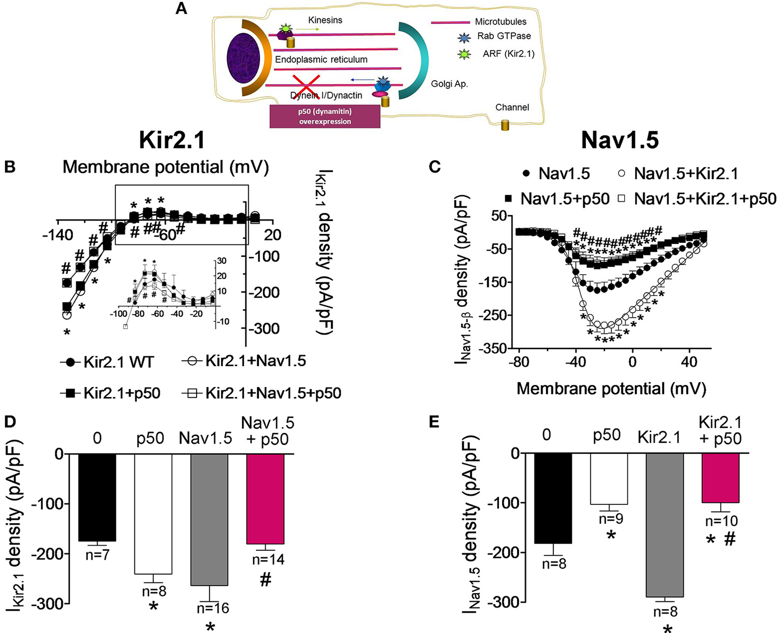 Effects of the dynein/dynactin complex inhibition on Kir2.1 and Nav1.5 channels trafficking. (A) Schematic representation of a cell highlighting the role of the dynein/dynactin complex on ion channel trafficking. (B,C) Current-density voltage relationships for IKir2.1(B) and INav1.5(C) recorded in CHO cells expressing the constructs indicated together or not with dynamitin (the p50 subunit of dynactin) to inhibit the dynein/dynactin complex. (D,E) IKir2.1 density at −120 mV (D) and peak INav1.5(E) recorded in cells expressing the constructs indicated alone or together with p50. Each point/bar represents the mean ± SEM of “n” cells of ≥4 preparations. *P < 0.05 vs. cells transfected with Kir2.1 or Nav1.5 channels alone; #P < 0.05 vs. cells transfected with Kir2.1+Nav1.5 without p50. For clarity the results of other statistical comparisons were not shown.