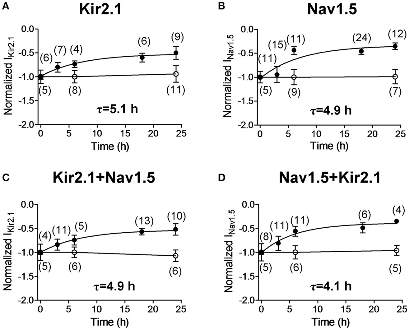 Time course of internalization of Kir2.1 and Nav1.5 channels. (A–D) Mean normalized density of the currents recorded in CHO cells expressing the constructs indicated and incubated with BFA (50 ng/mL) (solid circles) for 0 (Control), 3, 6, 18, and 24 h or with 1% ethanol (open circles) for 0, 6, and 24 h. Half-time constants (τ) yielded by the monoexponential fit to the BFA data are also shown. Each point represents the mean ± SEM of (n) cells of ≥4 preparations.